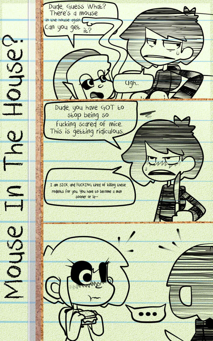 WARNING: This Creepypasta fanbased, canonbased, whatever the hell you would call this comic strip serie contains mature content. Such as swearing, violence, stupidity, nose-picking, wiggly arms, crazyness, hyperness, WTFness, Romance, Bloo- I mean ketchup, Censored nudity, and some pages may offend fangirls\fanboys, weeaboos, or whatever. I don't fucking know.