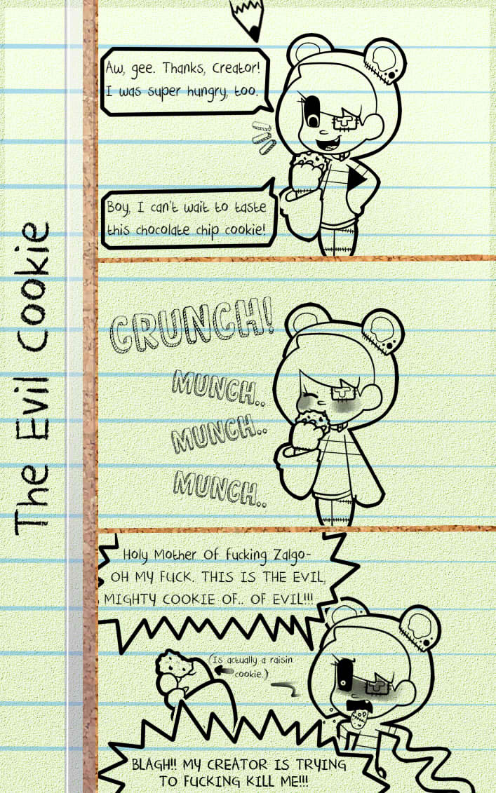 WARNING: This Creepypasta fanbased, canonbased, whatever the hell you would call this comic strip serie contains mature content. Such as swearing, violence, stupidity, nose-picking, wiggly arms, crazyness, hyperness, WTFness, Romance, Bloo- I mean ketchup, Censored nudity, and some pages may offend fangirls\fanboys, weeaboos, or whatever. I don't fucking know.