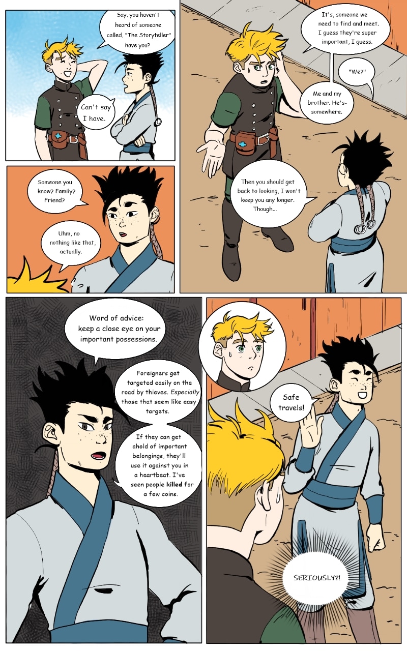 Twin brothers discover their parents dead in their home. Knowing something sinister behind it, the two set off on a journey to find out just who would murder them, and why. The only lead they have is a mysterious brooch left behind, and a storyteller who might be able to give them some answers.