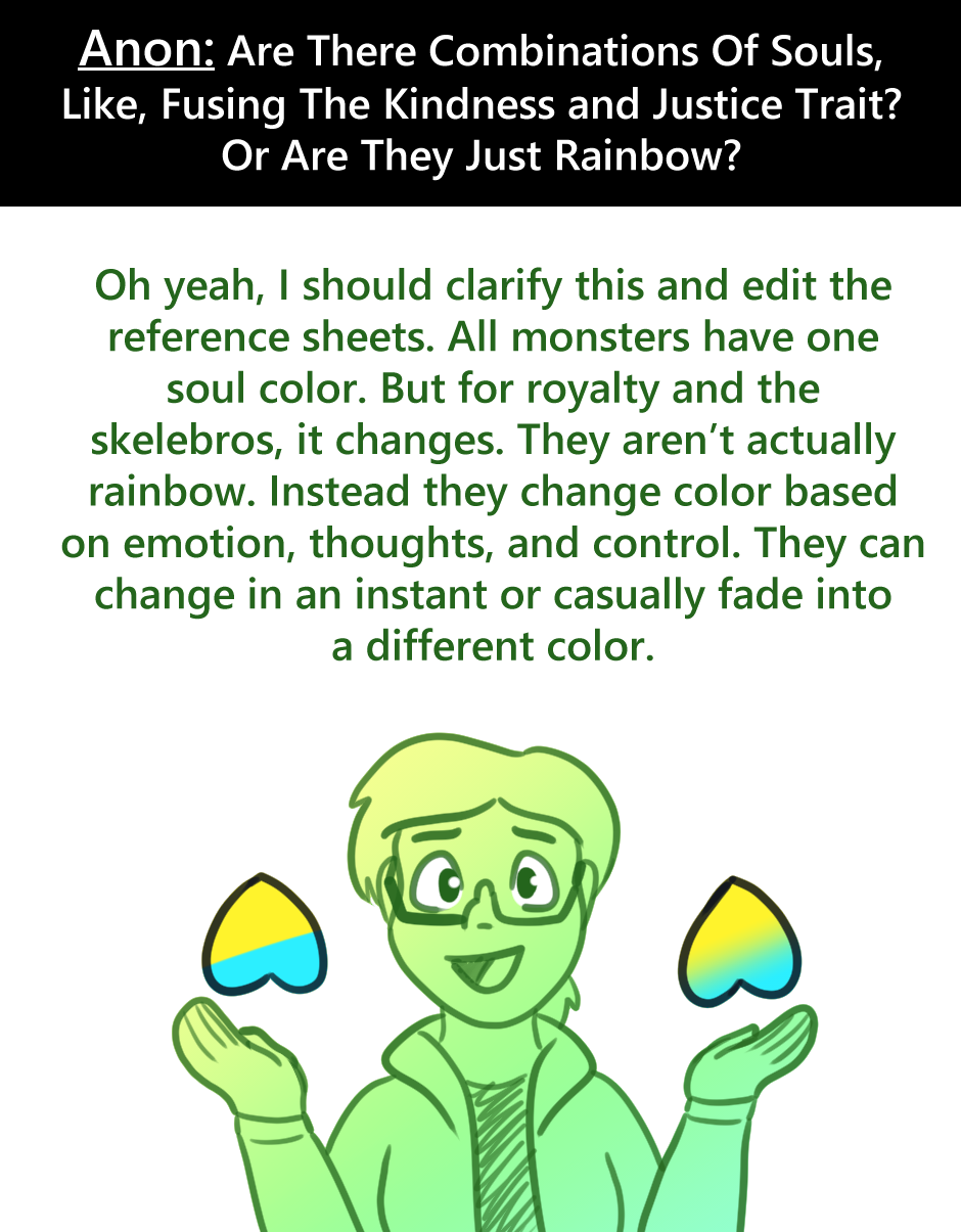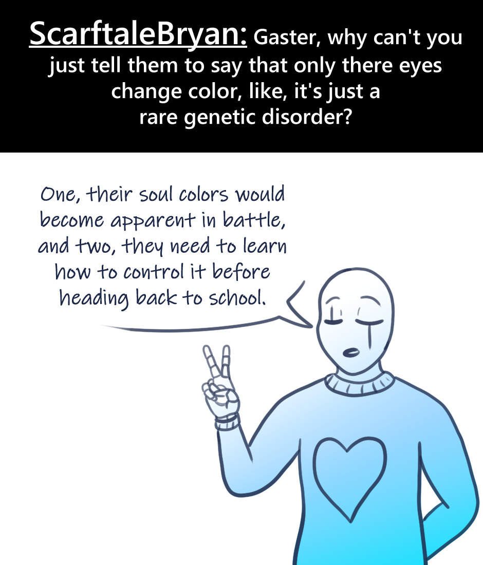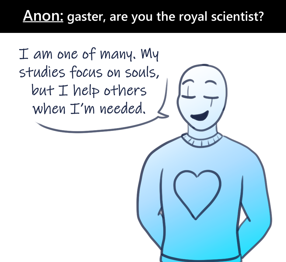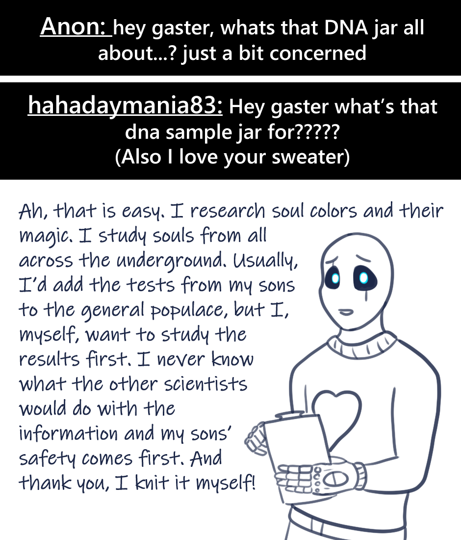Answered daily on Tumblr and Discord! (1-5) Ask: layout of FoaNS Okay so this explains why some of their mail with be missing. If it’s addresses to me or contain spoilers, I’ll most likely snatch it. :P Ask: DNA Jar You got Gaster talking. XD Too much text? I don’t know. Ask: Genetic Disorder I changed up the ask style slightly. There haven’t been many asks here yet, so it’s more apparent with one of my other stories. Ask: What is Love? asdfghjkl Ask: Royal Scientist Lookit his proud little stance. Ask: Soul Color Change I’ve had a long day and drew myself eh but oh well.