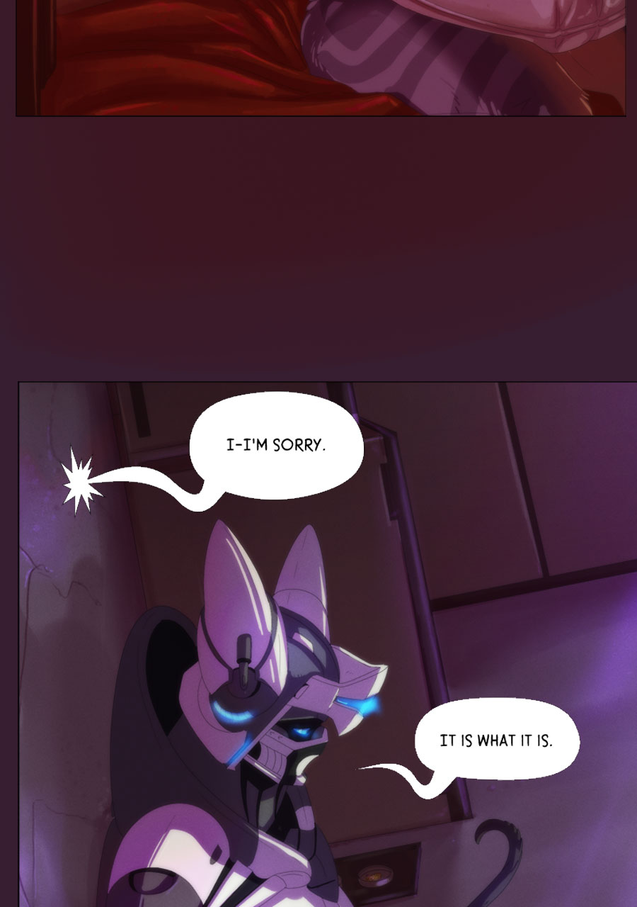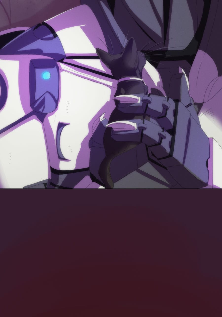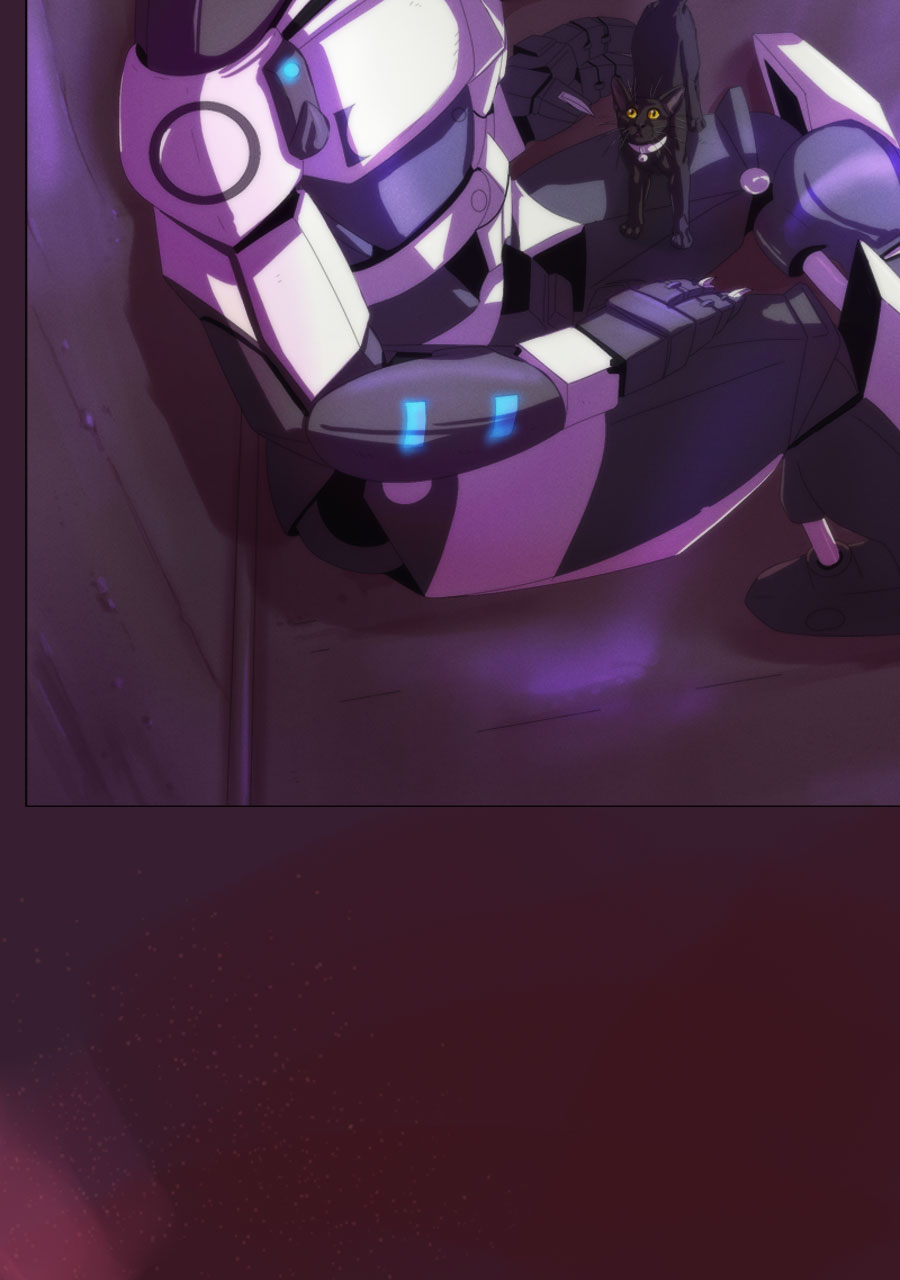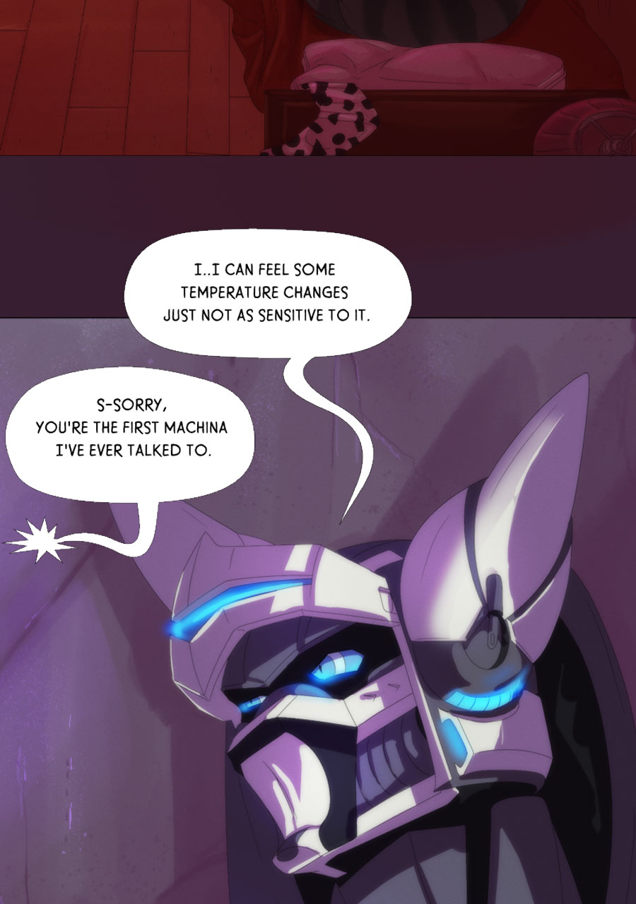 See this is why I like Tapas better than Webtoon-- i can expand panels here to enjoy all the meticulous detail you've put into this amazing comic. Like how this is the first time i noticed the mech being "repurposed" is actually strapped down (not unconscious like i thought the first time i read this) and has had all his claws ripped out and is bleeding from the wounds that horrific act has left behind. The next panel emphasizes how machina acutely perceive and understand this fate at the hands of indifferent ferum by Rex sending power (intentionally or unintentionally?) to his own claws while he resignedly examines them. We're all brought back to the moment in the apartment, however,