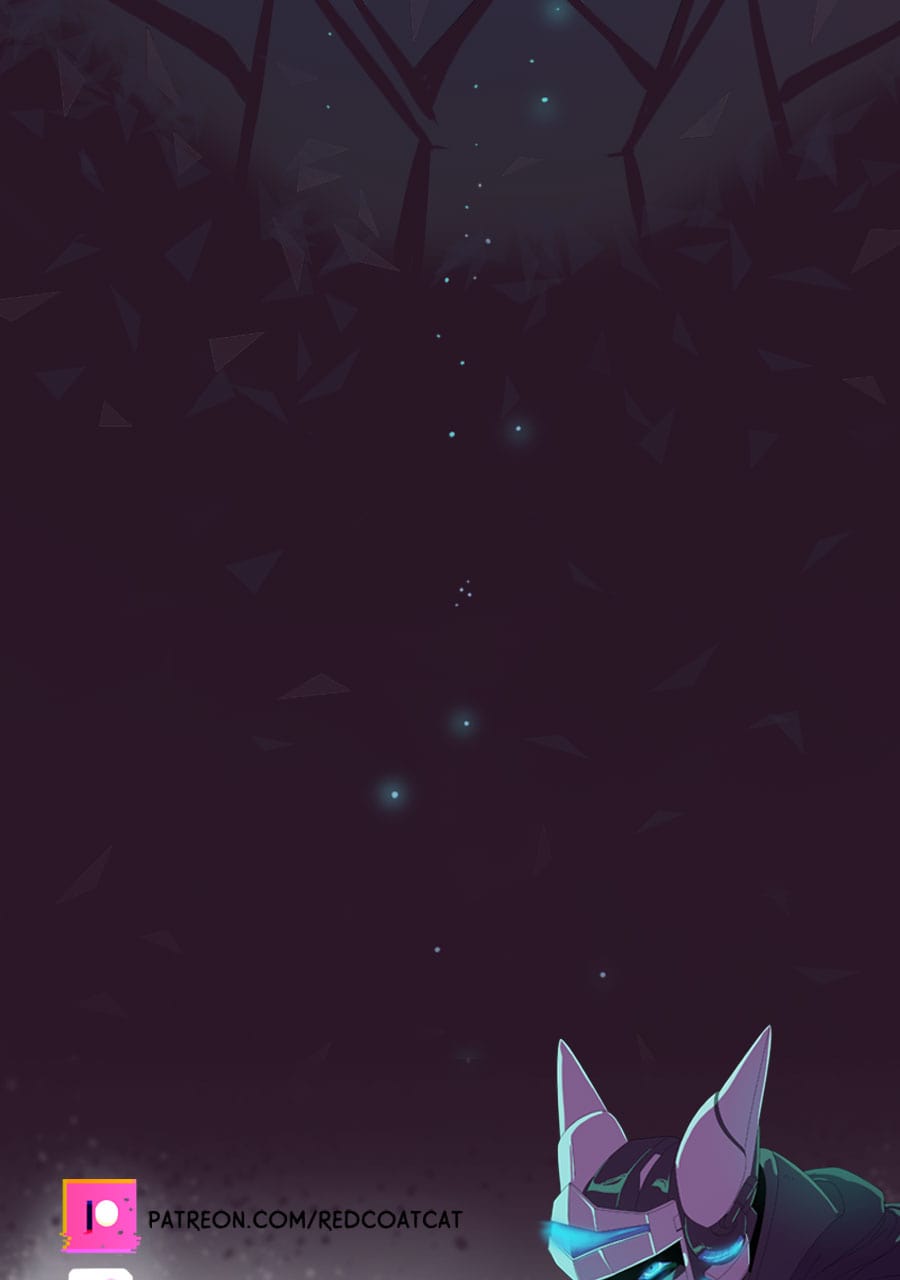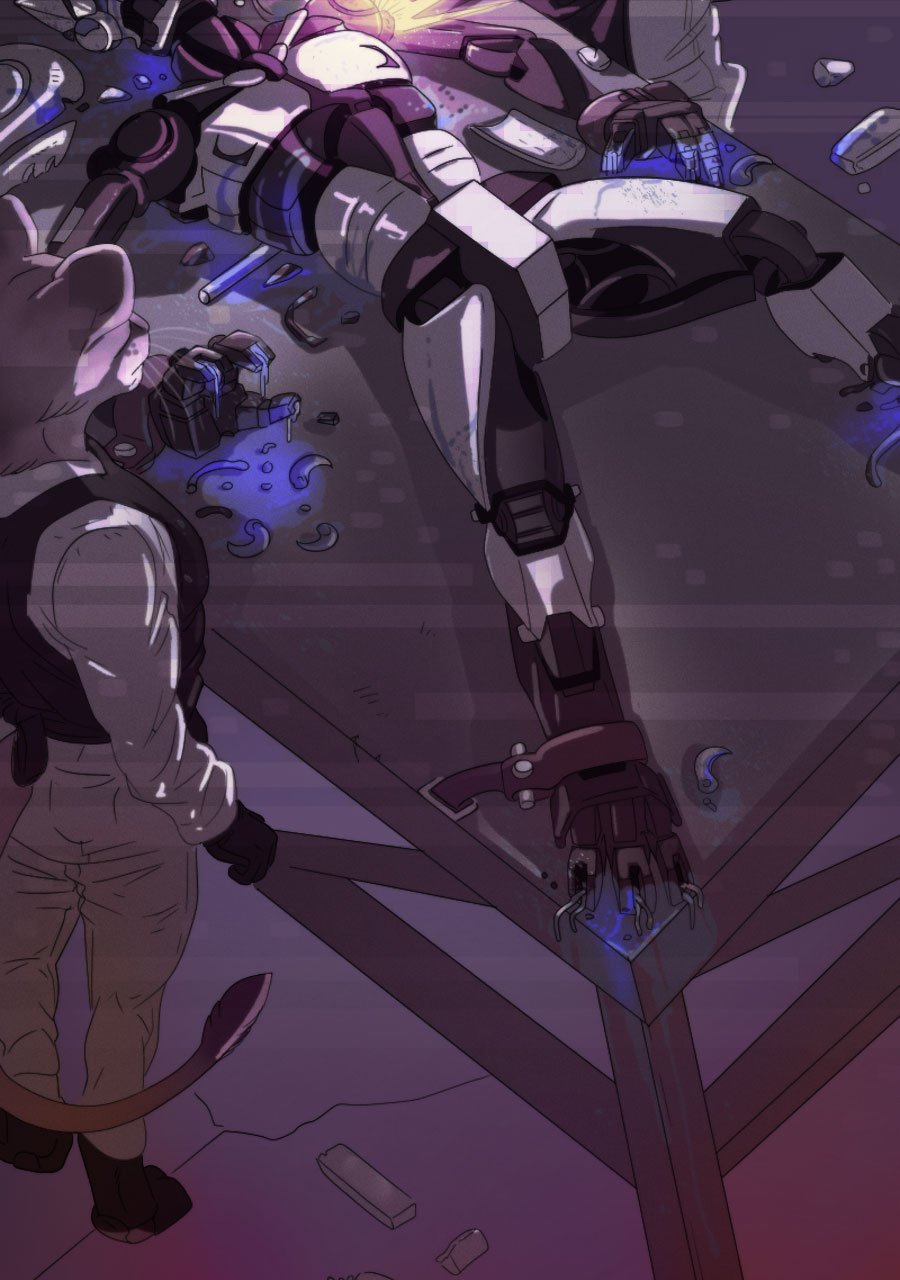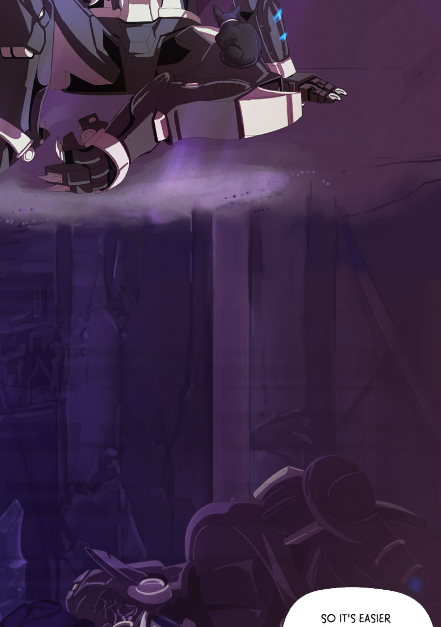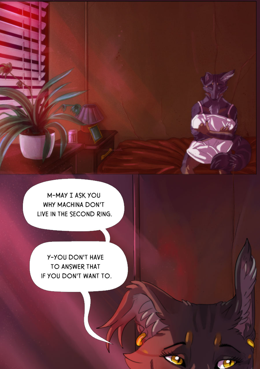 See this is why I like Tapas better than Webtoon-- i can expand panels here to enjoy all the meticulous detail you've put into this amazing comic. Like how this is the first time i noticed the mech being "repurposed" is actually strapped down (not unconscious like i thought the first time i read this) and has had all his claws ripped out and is bleeding from the wounds that horrific act has left behind. The next panel emphasizes how machina acutely perceive and understand this fate at the hands of indifferent ferum by Rex sending power (intentionally or unintentionally?) to his own claws while he resignedly examines them. We're all brought back to the moment in the apartment, however,