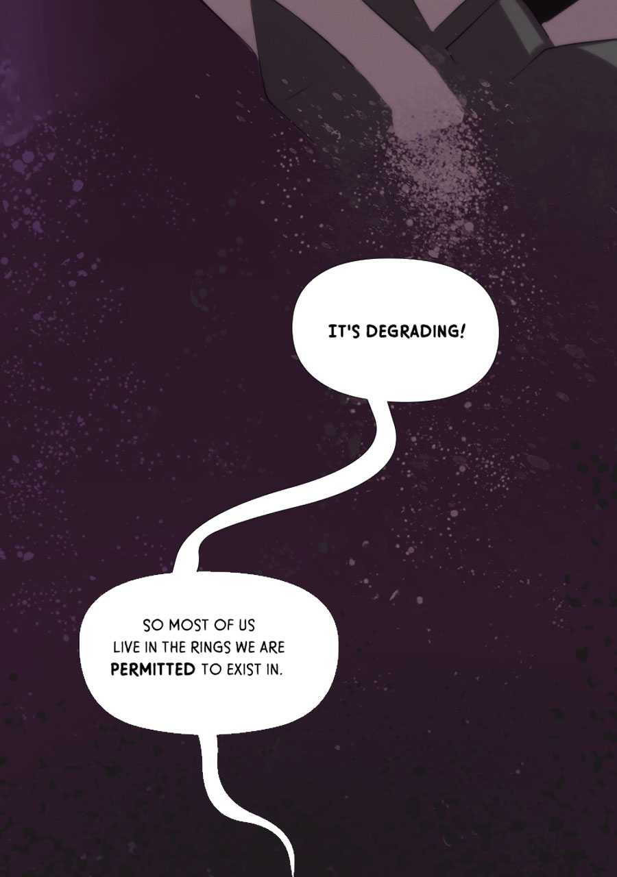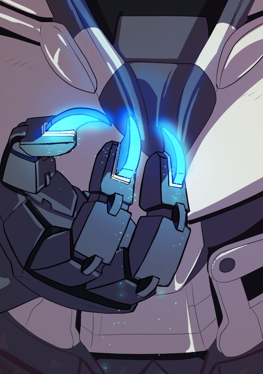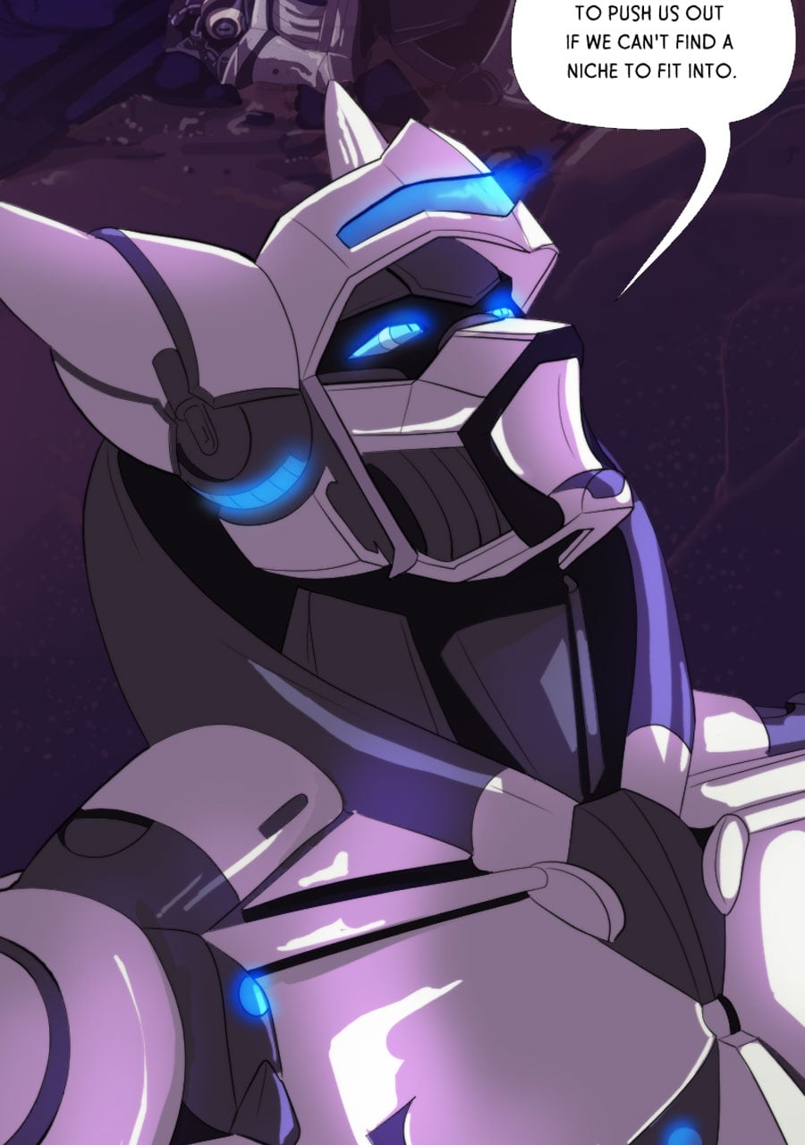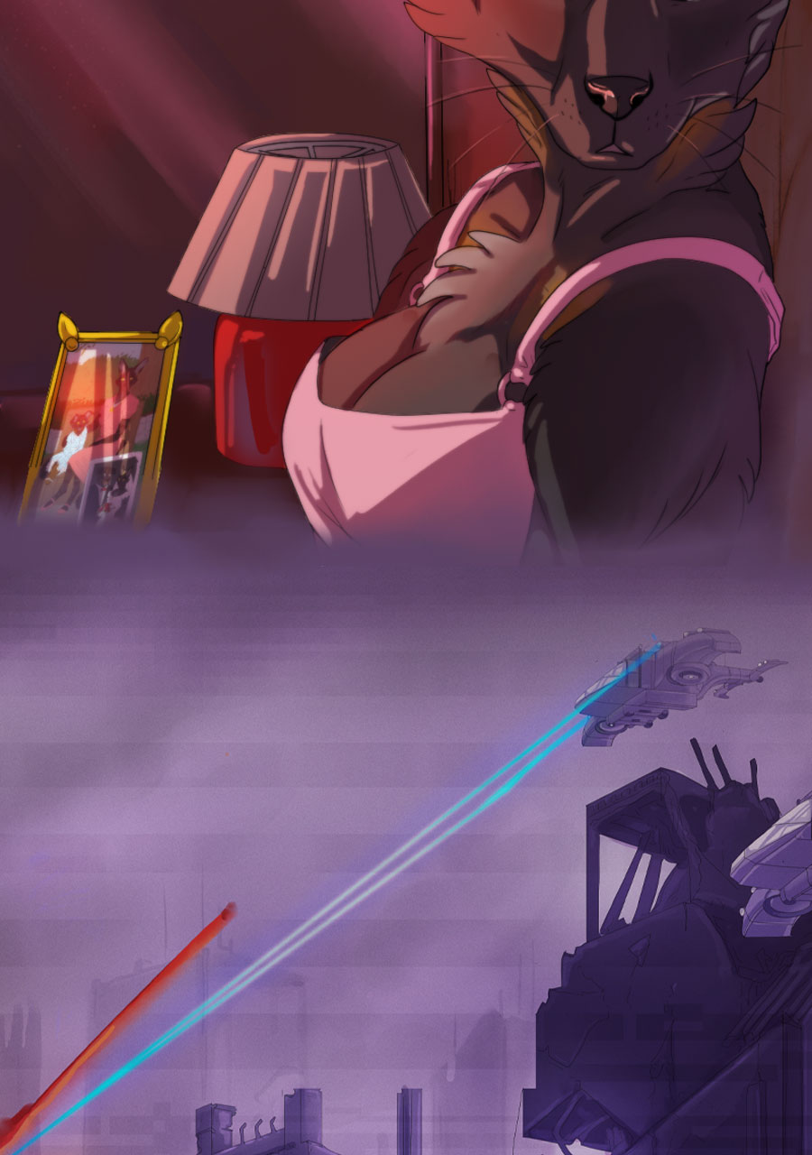 See this is why I like Tapas better than Webtoon-- i can expand panels here to enjoy all the meticulous detail you've put into this amazing comic. Like how this is the first time i noticed the mech being "repurposed" is actually strapped down (not unconscious like i thought the first time i read this) and has had all his claws ripped out and is bleeding from the wounds that horrific act has left behind. The next panel emphasizes how machina acutely perceive and understand this fate at the hands of indifferent ferum by Rex sending power (intentionally or unintentionally?) to his own claws while he resignedly examines them. We're all brought back to the moment in the apartment, however,