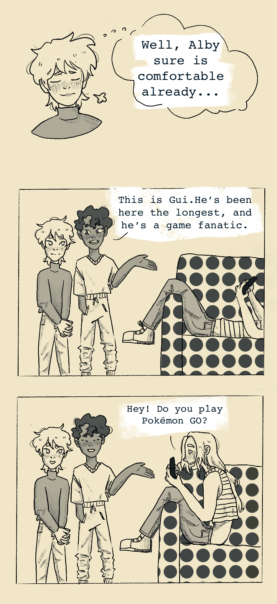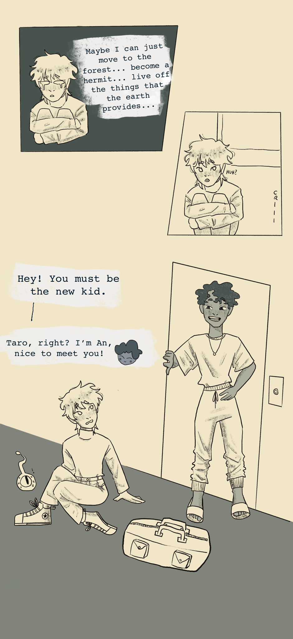 Hello, guys!! Taro meets a few of his roommates and starts to get settled in ^^ don't we all wish we had a friend to rescue us from the hallway sometimes? If you'd like to see more of my art, there's loads on my insta @girafaerisa :)