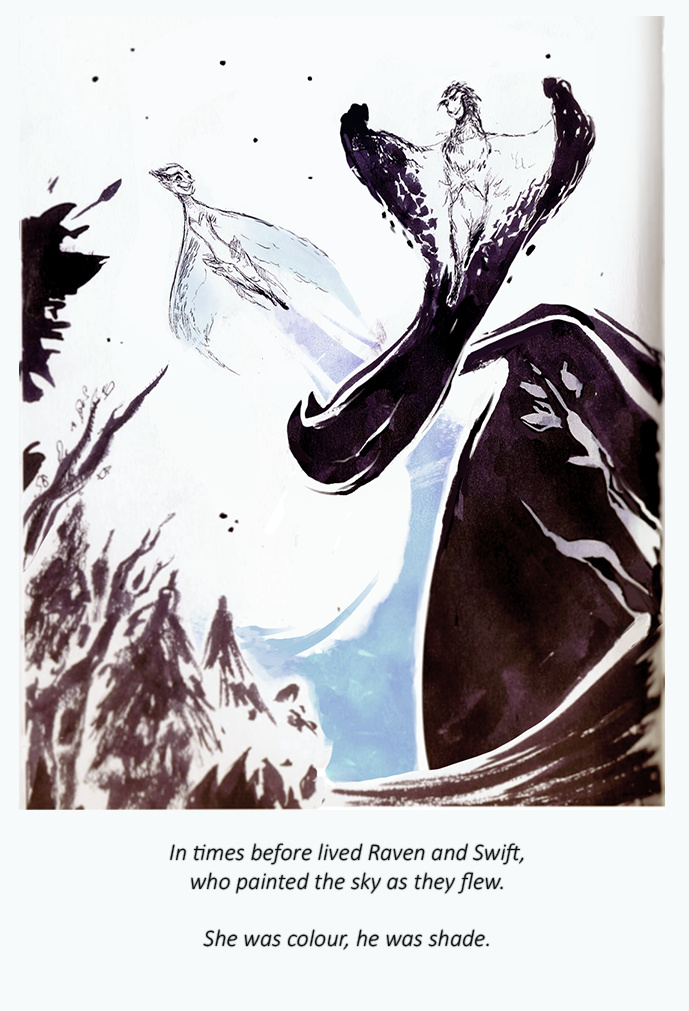 In times before, lived Raven and Swift, who painted the sky as they flew. She was colour, he was shade. Day 02 of #inktober2015
