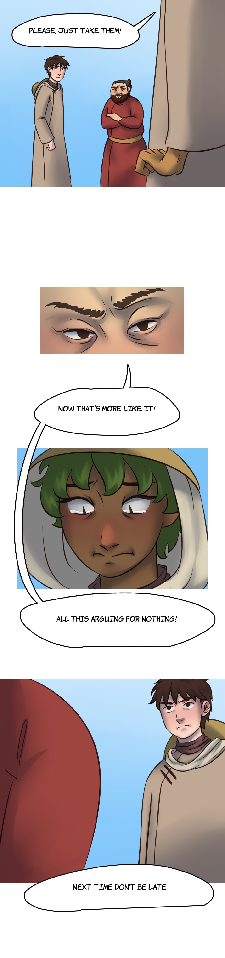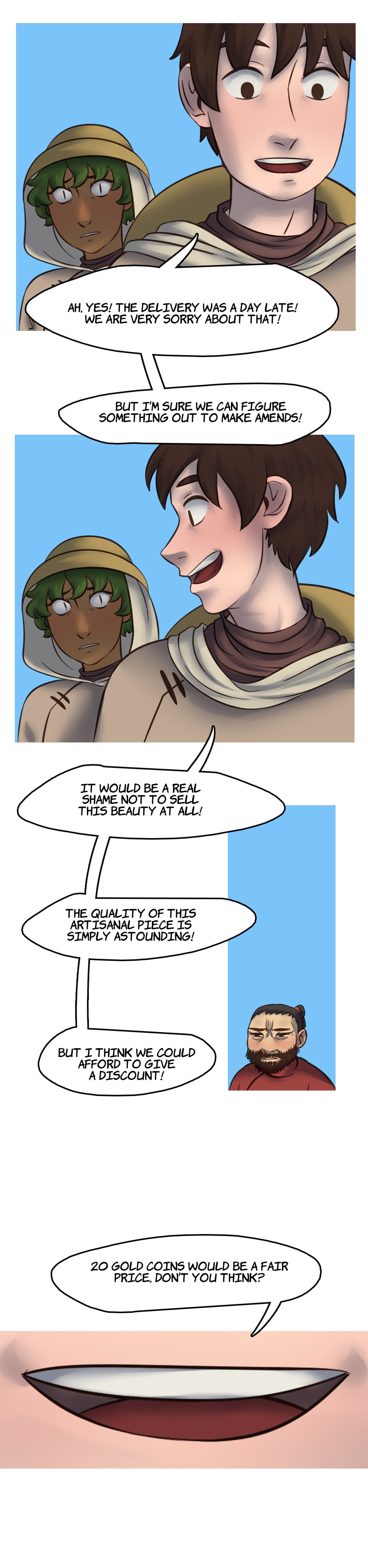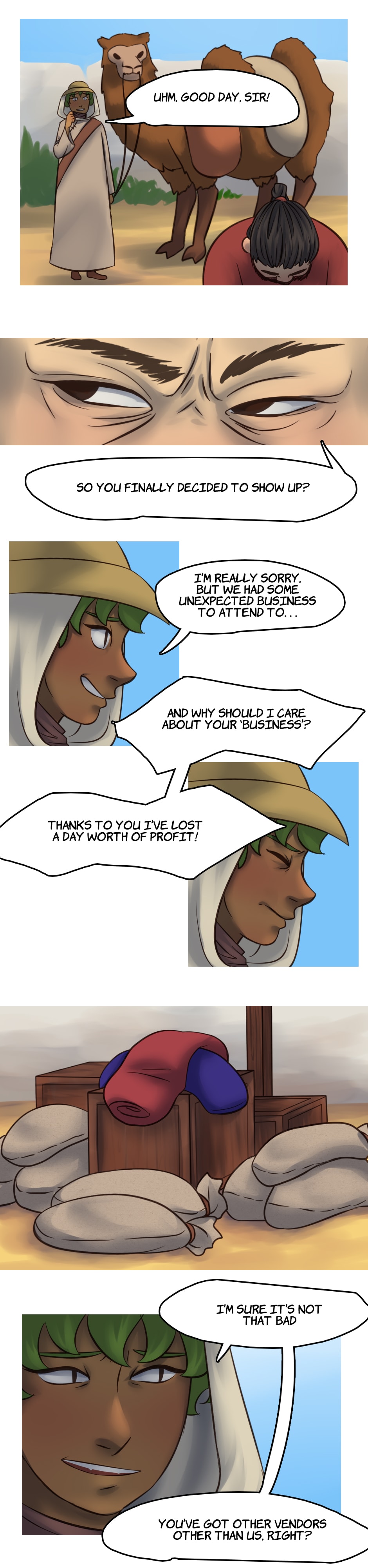 Our heroes go to a neighboring oasis to do some trades, but a customer is making a scene as the delivery is late.