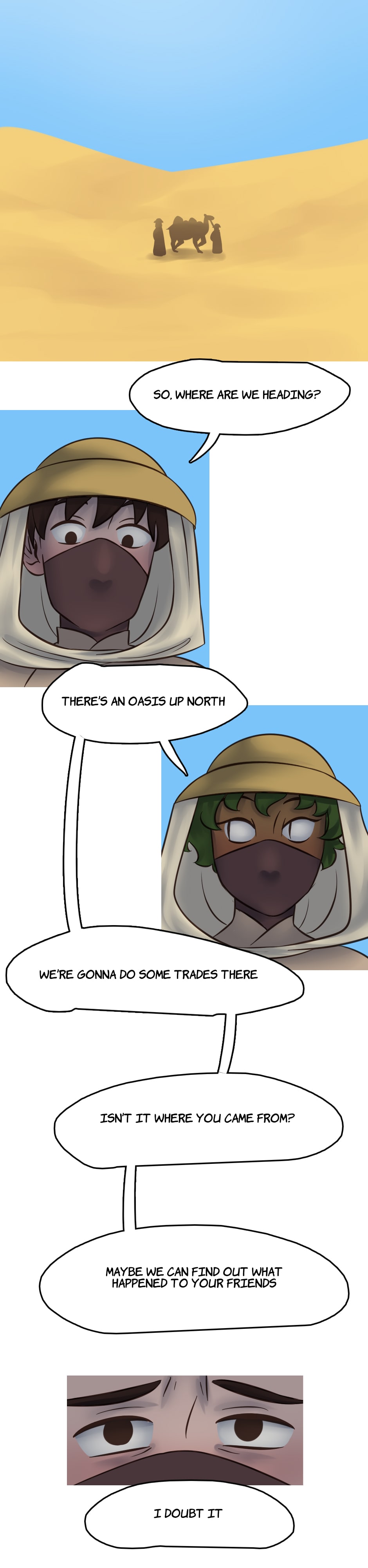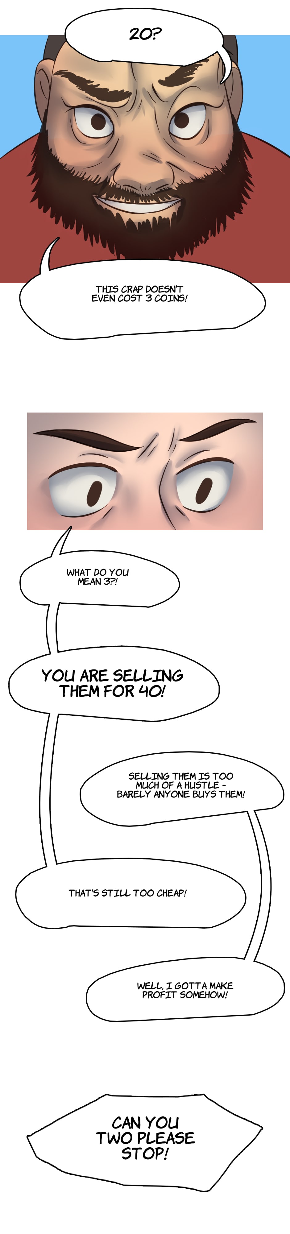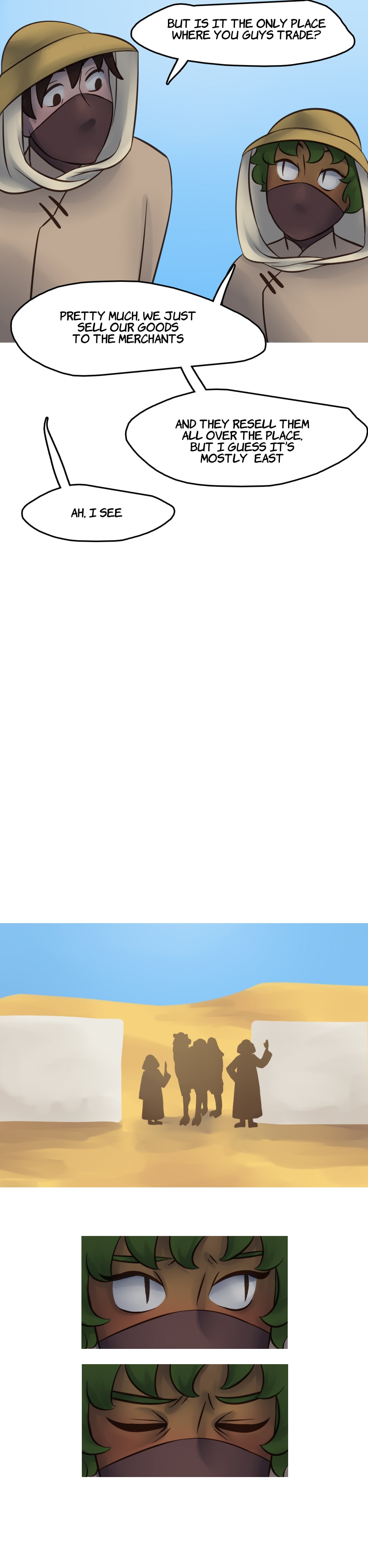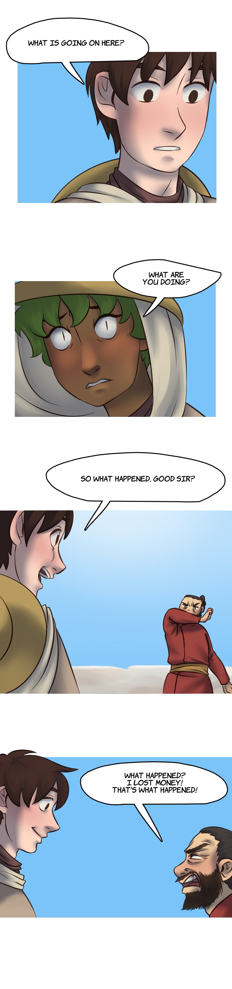 Our heroes go to a neighboring oasis to do some trades, but a customer is making a scene as the delivery is late.