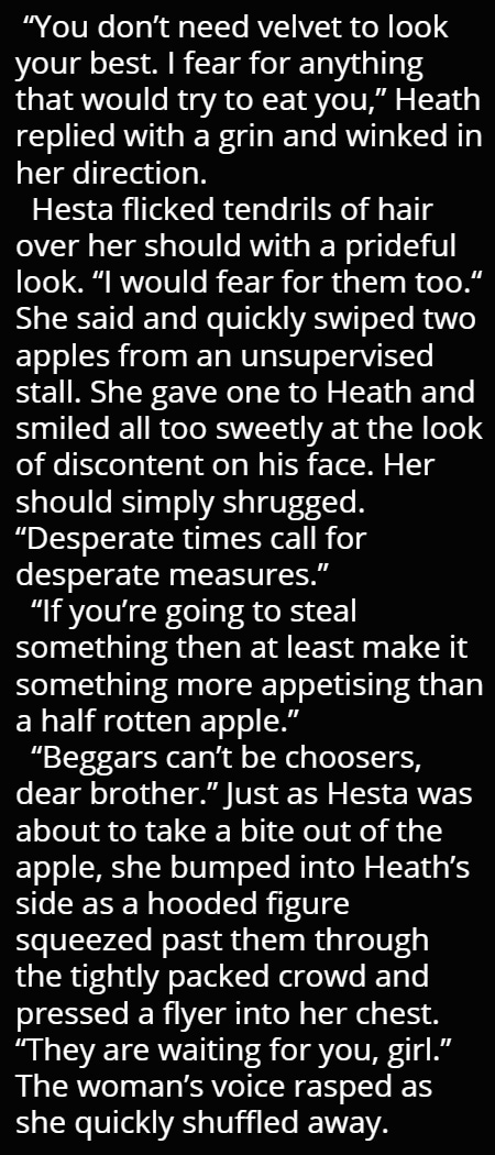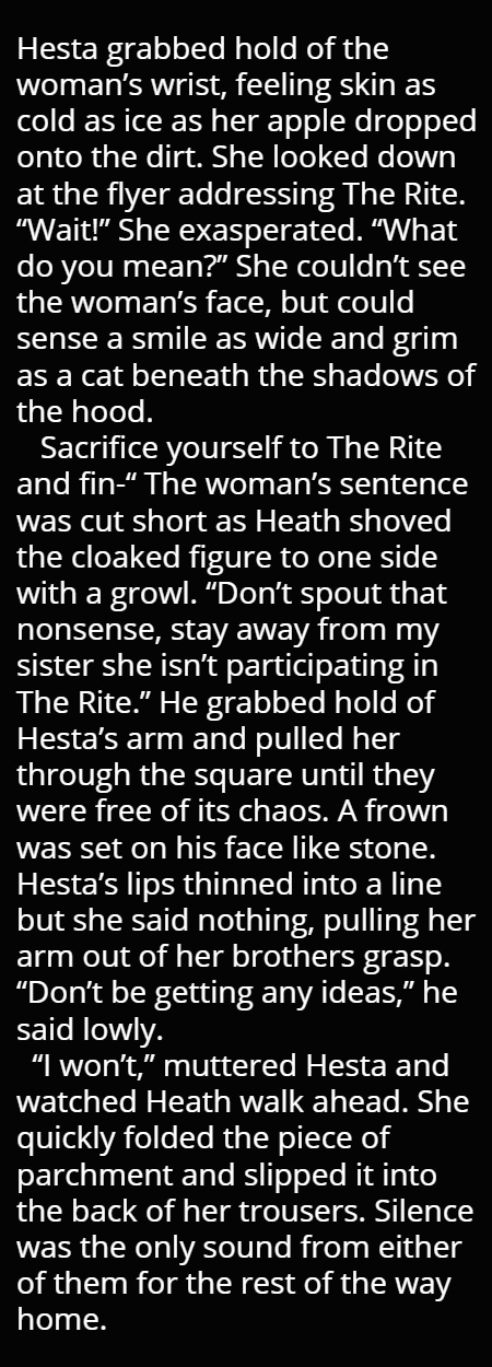 Hesta has always known she was destined for more. For years she has stared over the wall that divides their worlds. The sacrifice of The Rite was the perfect chance to escape. But little did she know just how much she was destined for... Hesta soon finds herself in a world tainted with secrets and blood, a world where she is next in line to one day rule.