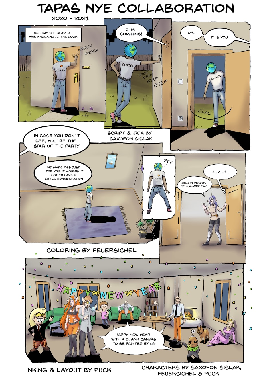 oh, so i really forgot to upload the new years collab ^^' I made this collab with this amazing artists and writers: Saxofon Sislak - https://tapas.io/series/Mr-Bugs/info Puck (has no comic jet) Was a pleasure to make this collab, and in this short time!