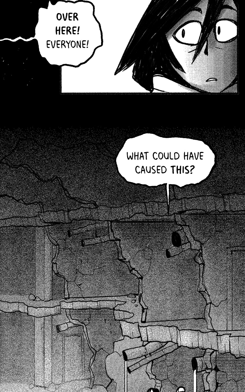 The group carefully make their way through a path of destruction and find an ominous room.