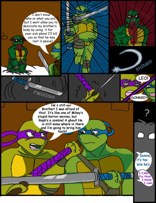 Warning! Mild Language, blood, and violence. This is a nonprofit fan comic/doujinshi. Raphael runs across a Purple Dragon whom at first he thinks is raping a young woman only to find out that he's eating her. It doesn't take too long into their fight that Raphael realizes that his opponent is not a cannibal, but the first in a Zombie outbreak. The dead of winter is fixing to take on a whole new meaning as it gets a lot colder.