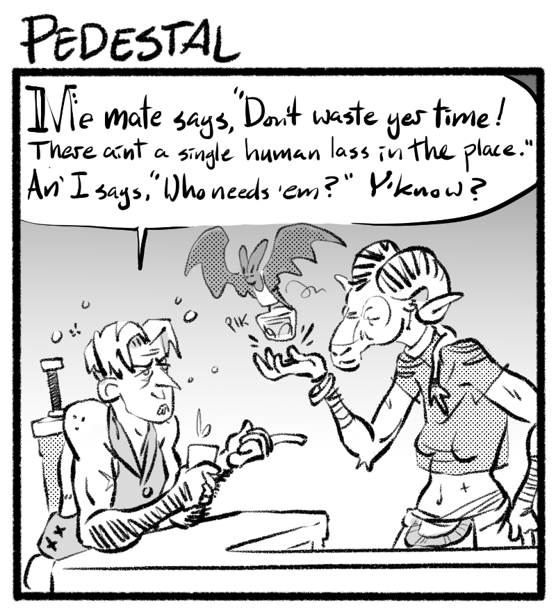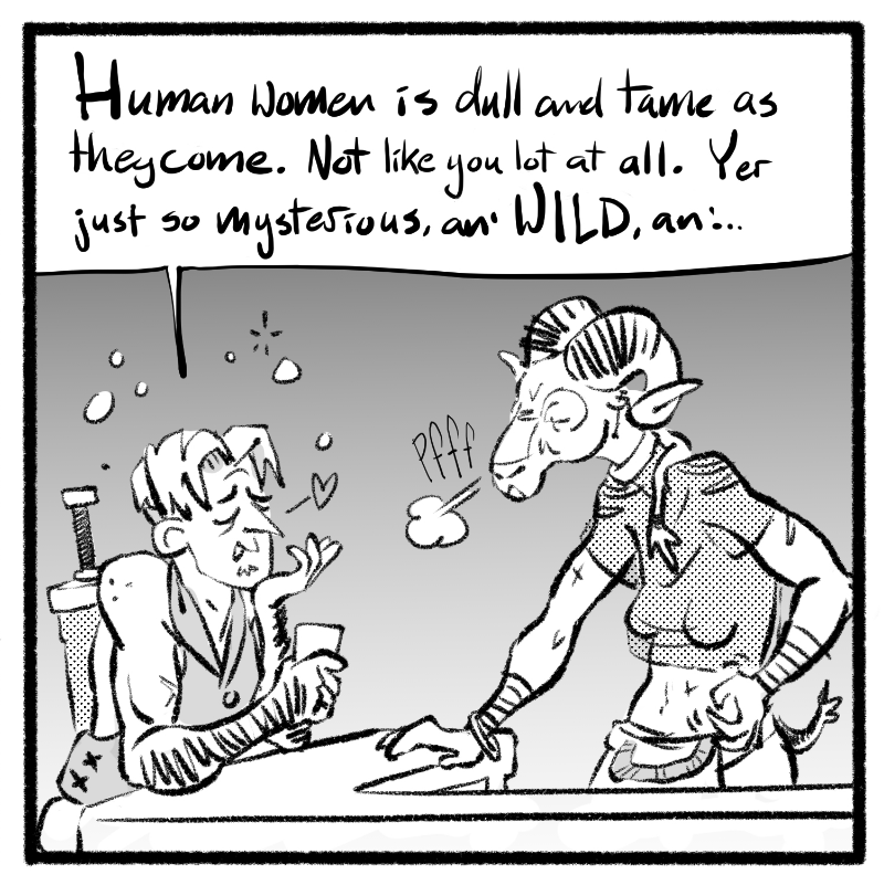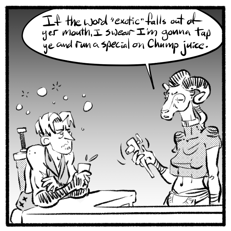 In a world where every dungeon holds untold treasures and the voices in the woods tempt the bold and foolish with tales of lost gods and eldritch magic, there is a place where the undead can unwind, a beholder can stop looking over her shoulder, and a goblin and a werewolf can get real drunk together. Unfortunately, humans have a way of stumbling in and wrecking a perfectly good time with their adventuring, politics, and I'm just going to say it, anthropocentric privilege.