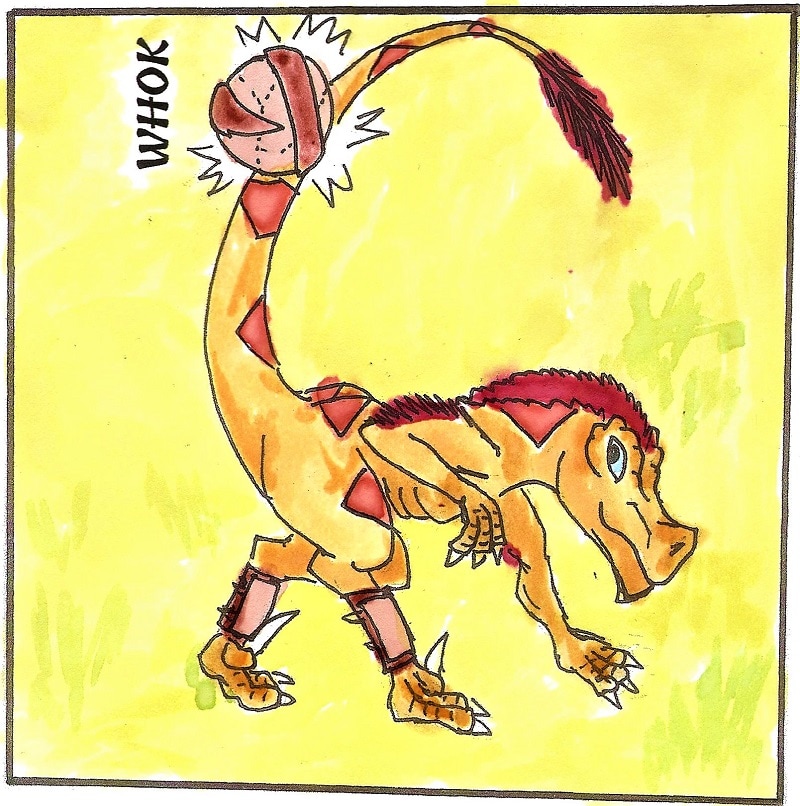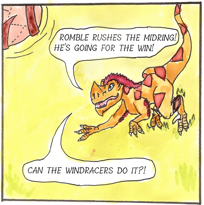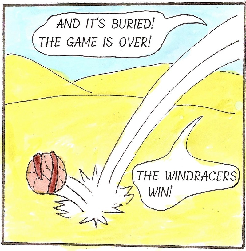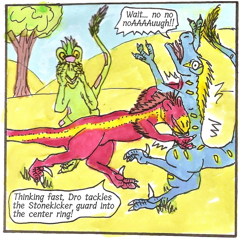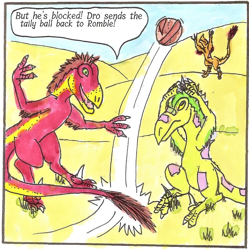 RAPTOR FACTS: In Taily Ball, each team takes turns on offense and defense, trying to get the ball to the center of three concentric rings, or outside them. Runners in the outring can whack the ball inwards, but can't tackle. In the midring, raptors can smack it in or out to pass or score, and can tackle and wrestle. In the center, they can wrestle and smack it out but cannot score.