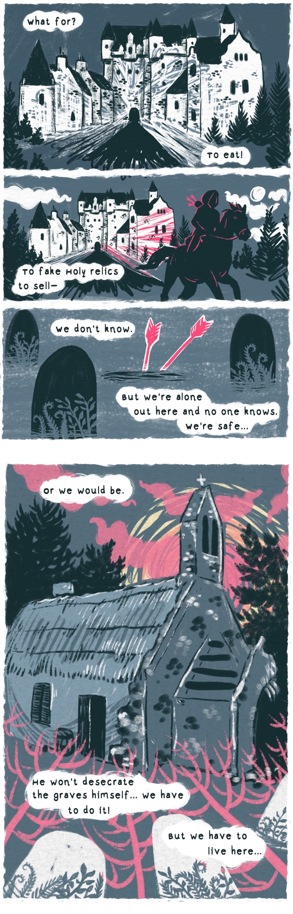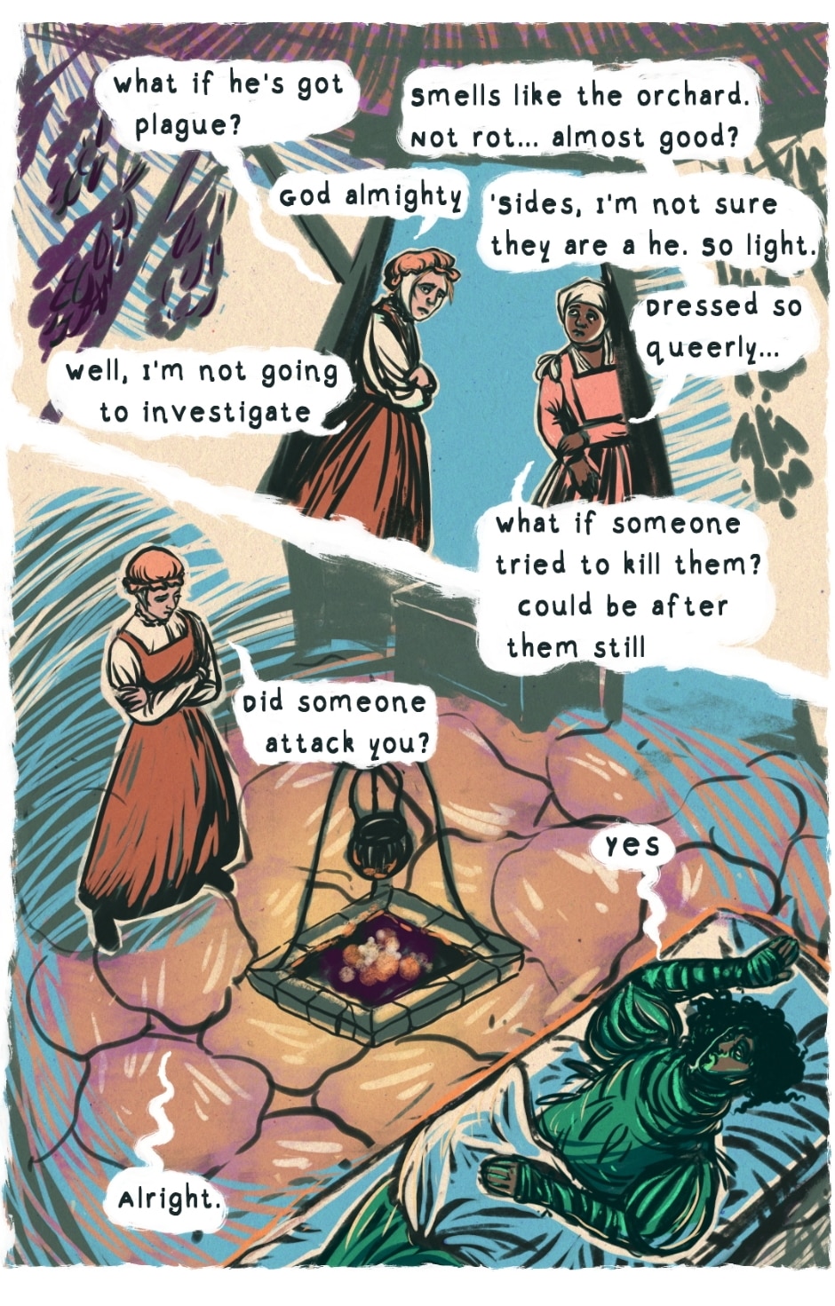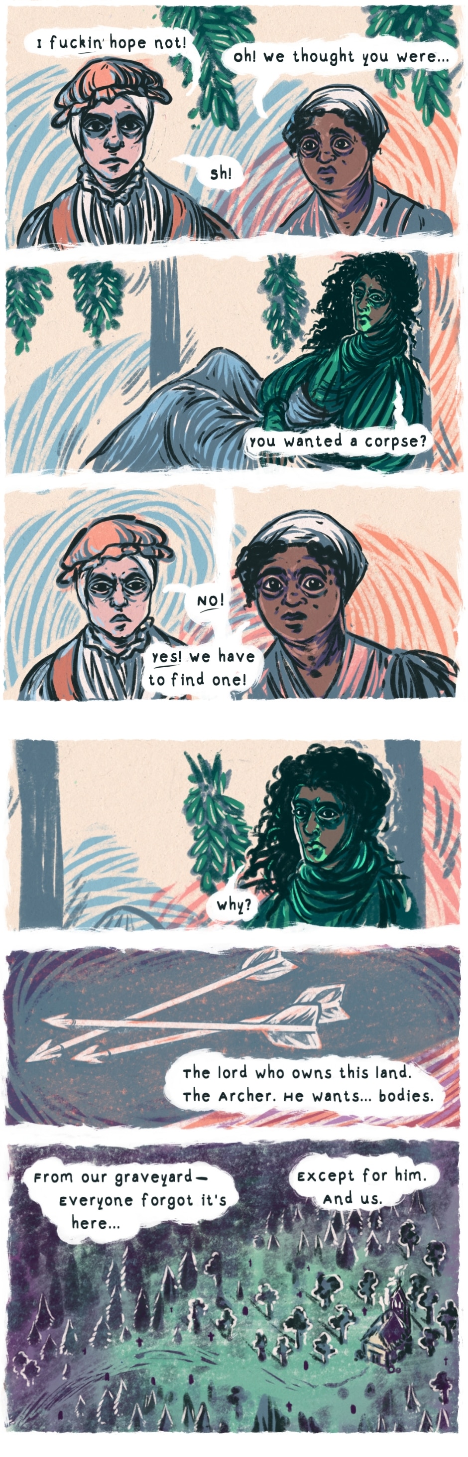The Trees Are Different Here is a historical folklore fantasy, set in a fictionalised Early Modern Europe. The story has themes of immortality, responsibility and death as well as queer and gendered identities.