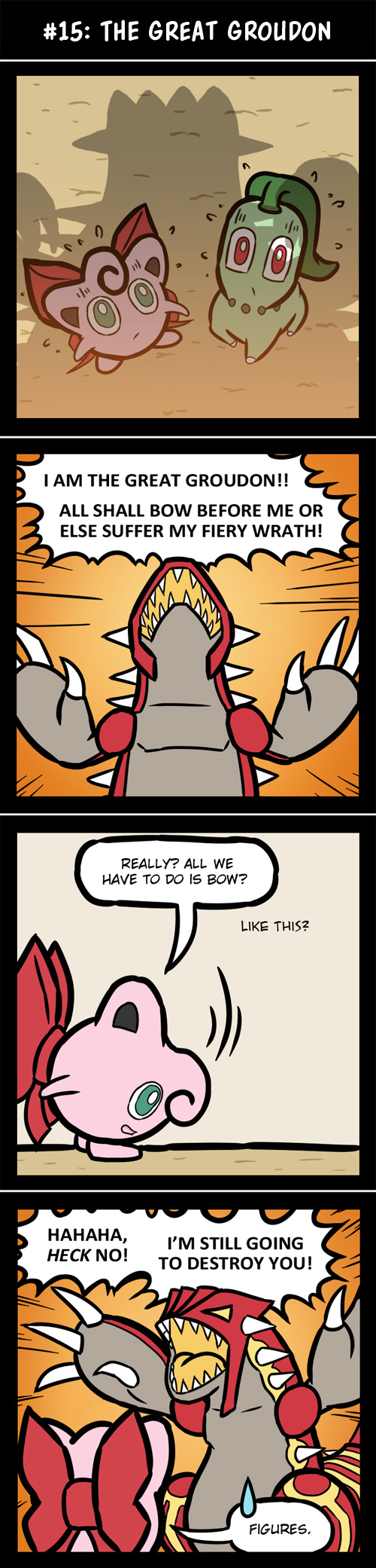 Whee, skipping right ahead to the more exciting parts of the plot~. Here, I will be utilizing the "Groudon" fight of the game as a way to represent pretty much every single wild Pokemon and especially boss Pokemon encounter in this particular universe, at least, in terms of jokes. He gets a different font for his voice because in game, he speaks in ALL CAPS all the time, which I imagined to be like a really loud, booming sort of voice that has a different sort of sound quality to it than normal people's speech.