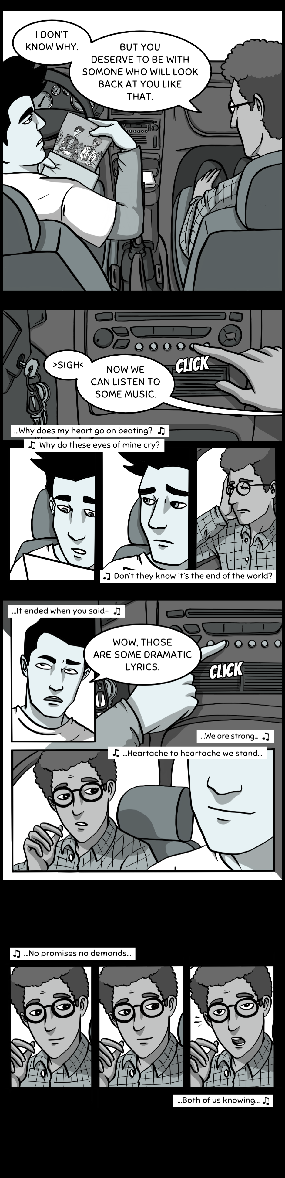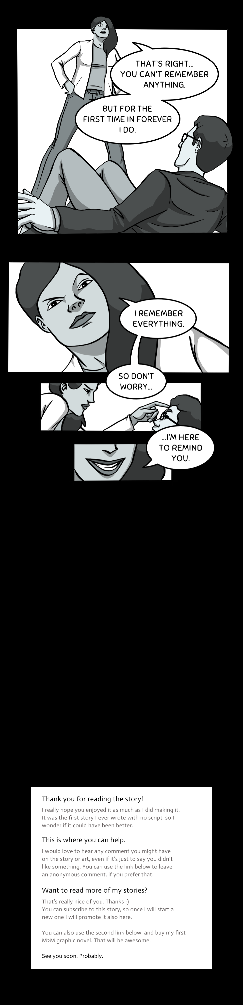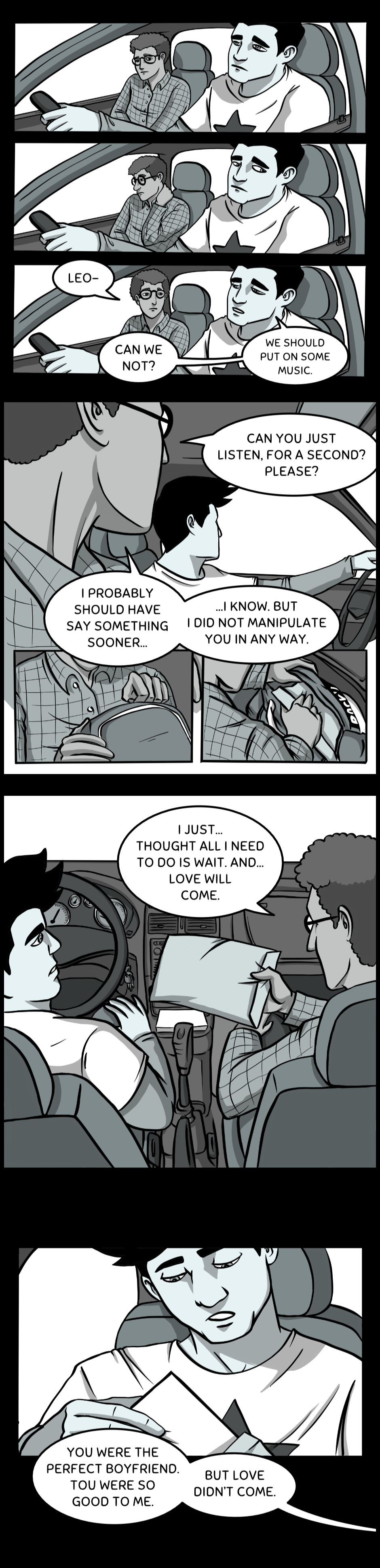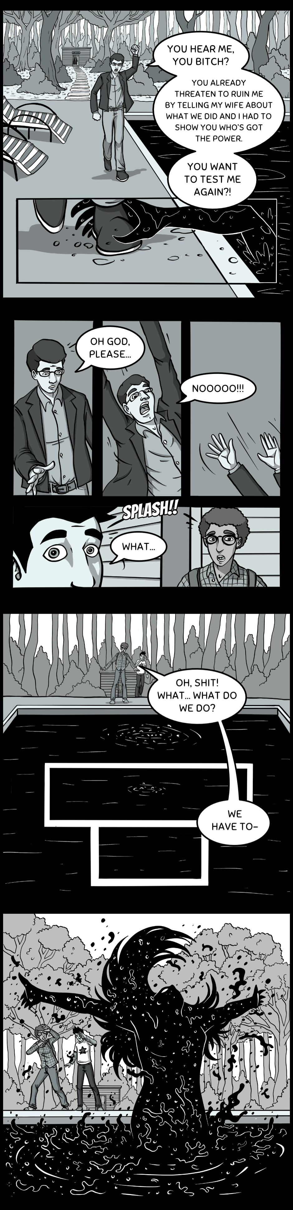 So I think I came to the conclusion that these shadow selfs are the opposite emotion/side of the individual. The women was caring and kind, yet her shadow was hateful and angry. Dan doesn't really love, that's why his shadow is more heartfelt and cared more in the "twisted" event. And I think Dan will be able to start loving, now that his shadow is with him, maybe they need to combine?? Idk. Tho not sure where these shadows came from? Obvs from the dreams but we didn't see the other couples self shadows? I really like the story, a lot of great things happening(especially the art), but there's some holes in the writing that's hard to see what you're trying to do. Would love to have a conversation about this, but great job overall