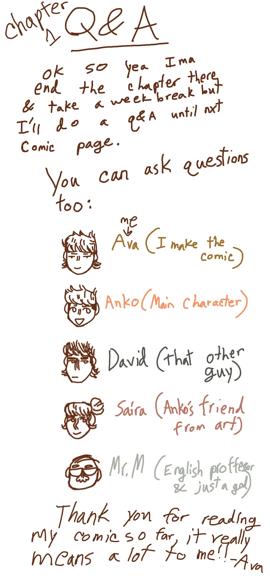 q and a for chapter one, you can ask questions in the comments and ill answer them in another post, i think ima gonna do a q and a at the end of each chapter but idk. i know no ones gonna ask questions but i just thought this would be fun
