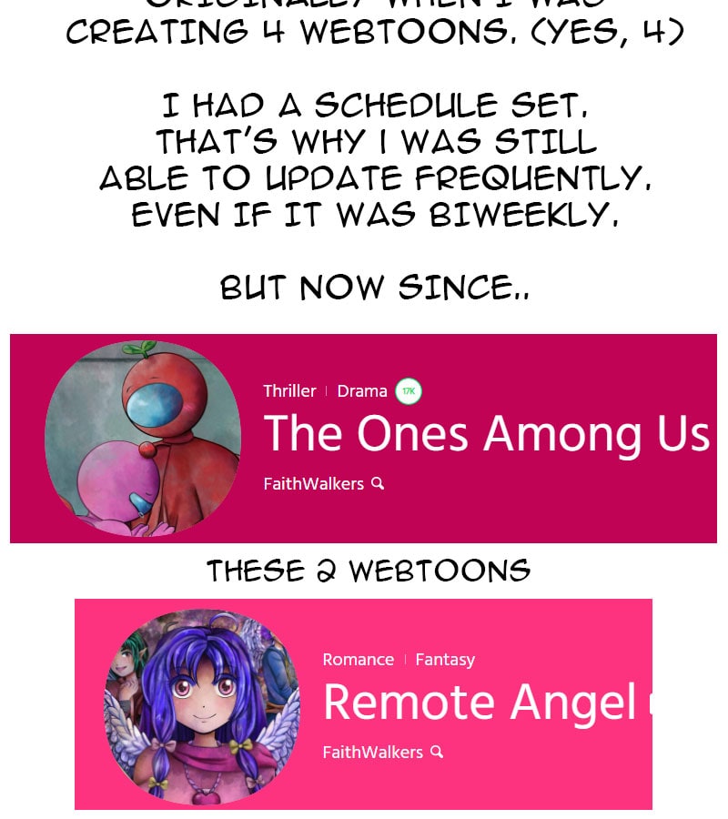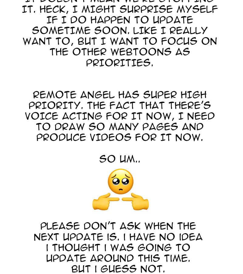 Don't worry yourself too much. You work really hard, despite what happened recently. No one has any right to demand more of you. So, I, and I know many others, will stay stick around with you, because your art is amazingly unique and your stories are top, too.