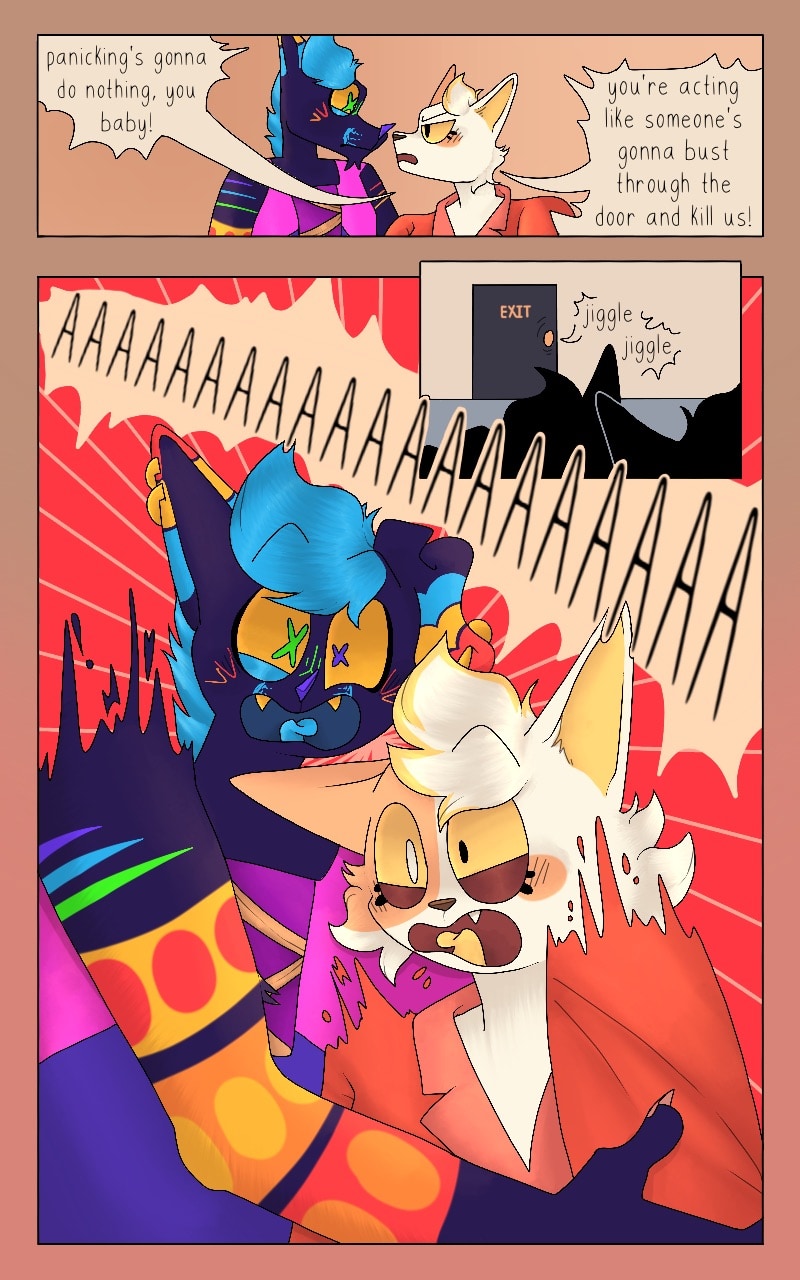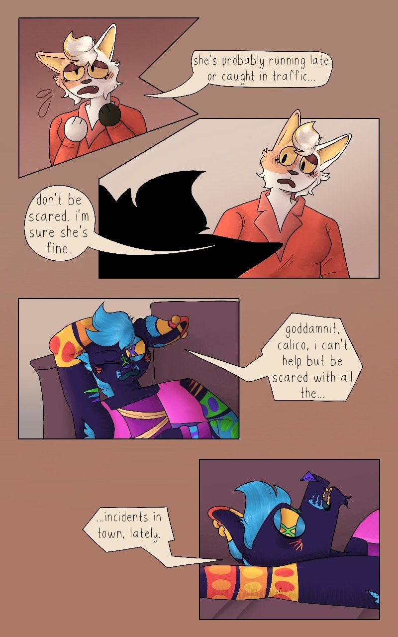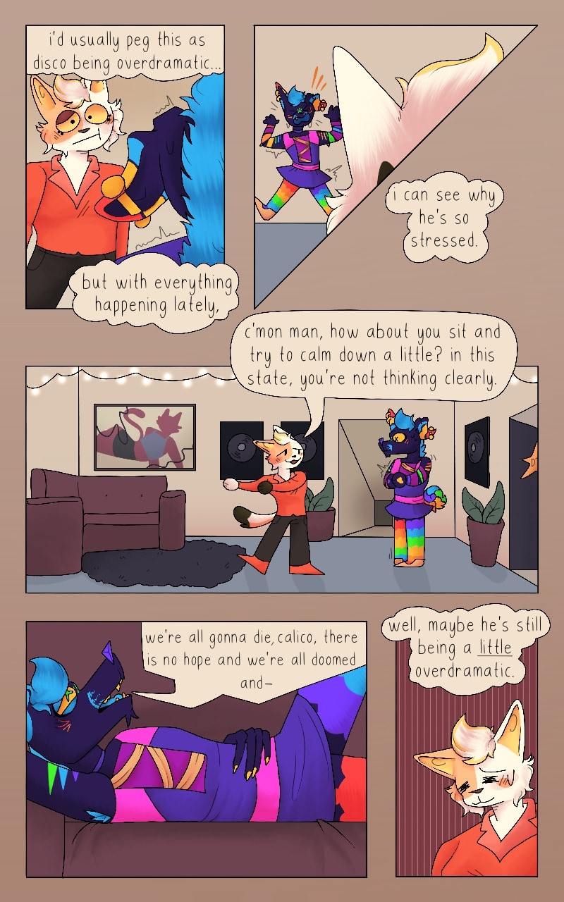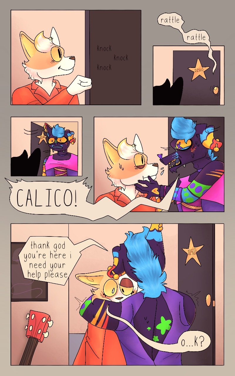 disco near pisses his pants in fear. calico tries to calm him down, but her attempts are in vain.