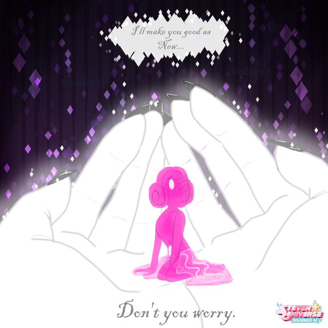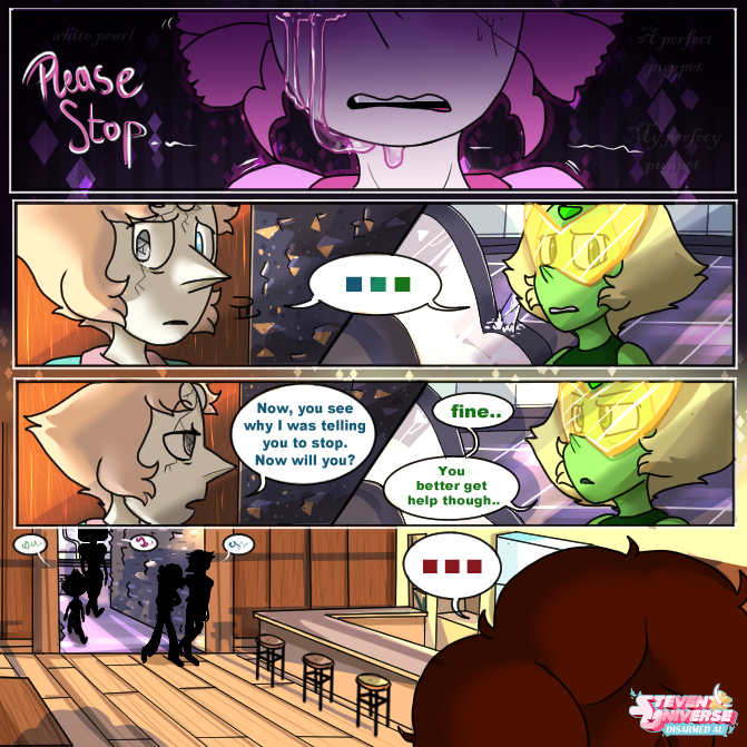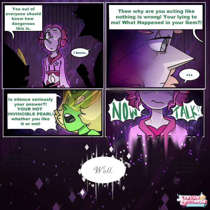 Pink pearl seeing Our Pearl cracked like her brought back a few not-so-pleasant memories. Peridot is also calling out for Pearl's ridiculous nature of not taking the damage seriously. Steven is seen coming back into the spotlight as the last panel as we slowly divert from B plot, and going back to Steven.