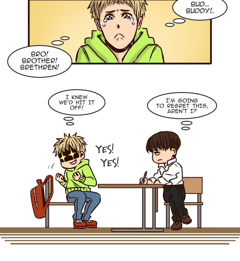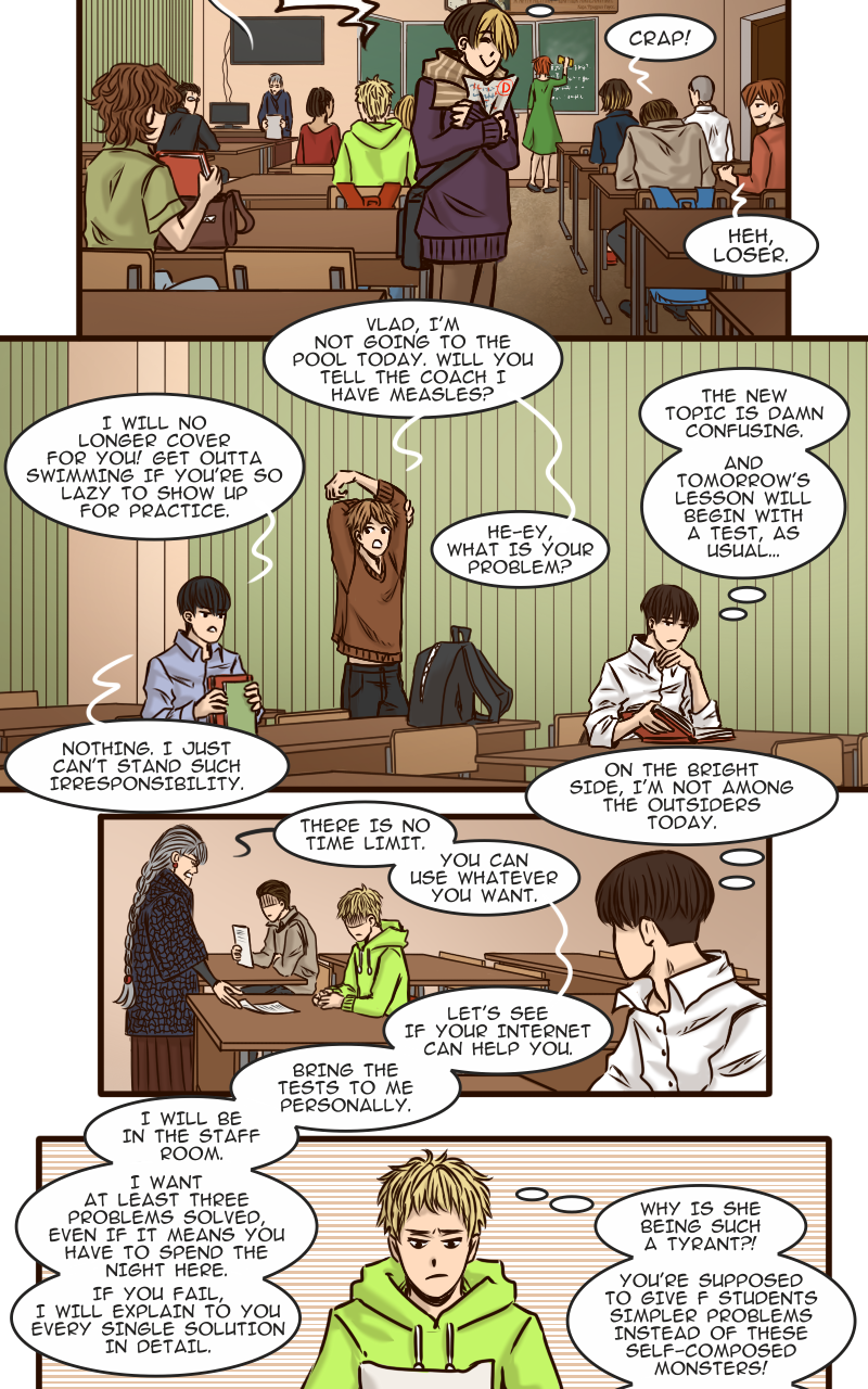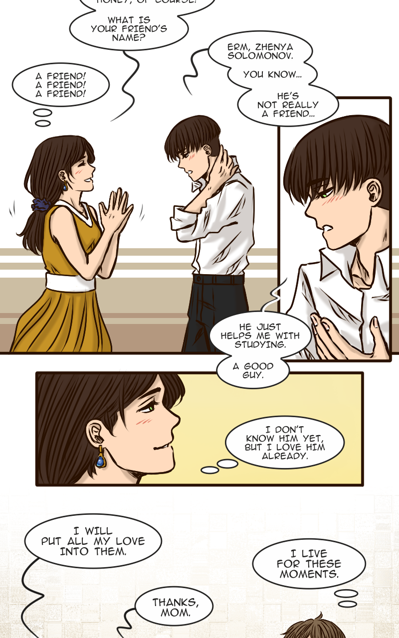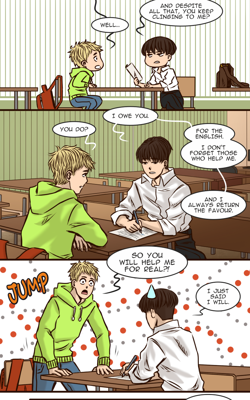 Arseniy can’t boast of having many friends, certainly not when all his classmates diligently avoid him. And it is not surprising – who would want to hang out with such a sulky guy? Apparently no one… except this new classmate Zhenya who suddenly drops into his cloudy life with a radiant smile and attempts to befriend him. How is Ars supposed to resist such a persistent sunbeam?