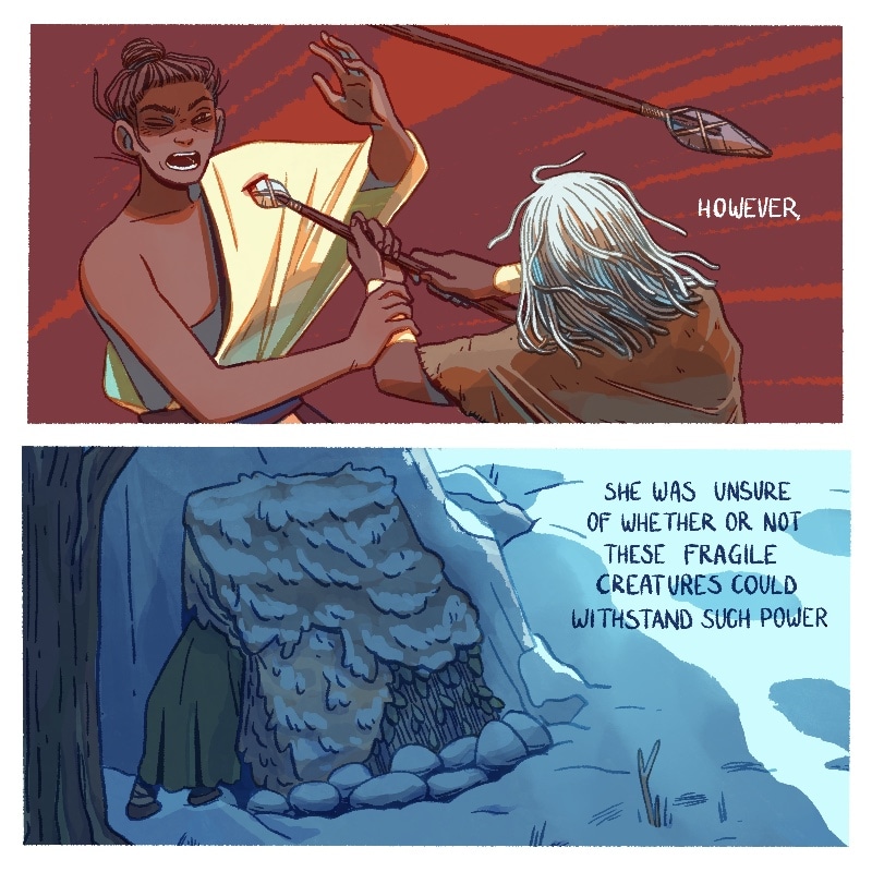Every page that I get to introduce a new colour makes me really happy! This red was particularly fun. To be fair though, this is probably the last time you'll see blood in this comic so ... don't get too excited. Lots more spears to come though, at least.