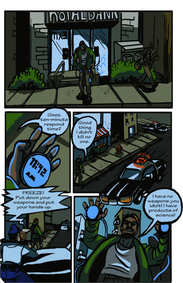 Michael Hart is a depressed alcoholic due to the passing of his wife and the downfall of his career as the Lead Detective of Forgotten City as well as his vigilante-ing as the hero, Even Off. The District Attorney has been murdered and former-Lead Detective Hart’s skills are once again needed by the Forgotten City Police Department. He must now beat his alcoholism and depression or at least cope with them in order to have a clear head as he returns to the streets as Even Off. While trying to solve the murder of the District Attorney, Hart will have to prove himself to the F.C.P.D.’s new Lead Detective, Marcus James —Hart’s former trainee. Even Off will have to deal with The Czar, the Russian Mob Boss who is an international black-market weapons dealer, and the poplularity-crazed villain Ztatik!