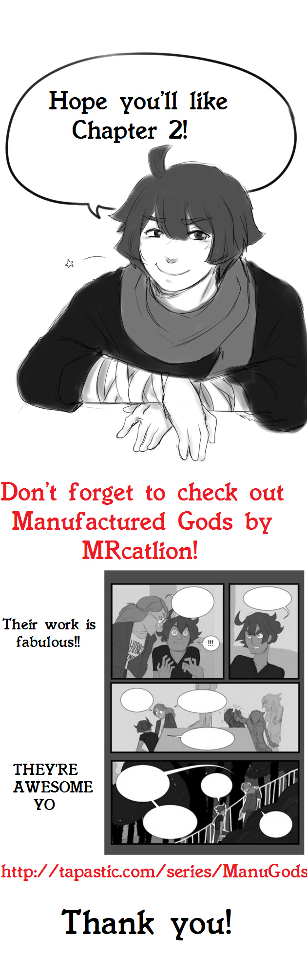 MRcatlion helped a great deal with overlooking the chapters and sticking through with this lame webcomic. Which is why I'm so eager to promote Manufactured Gods because they undoubtedly have something great in mind! As a great favor for them helping me out even while they were stressed, the least I can do is promote their work!