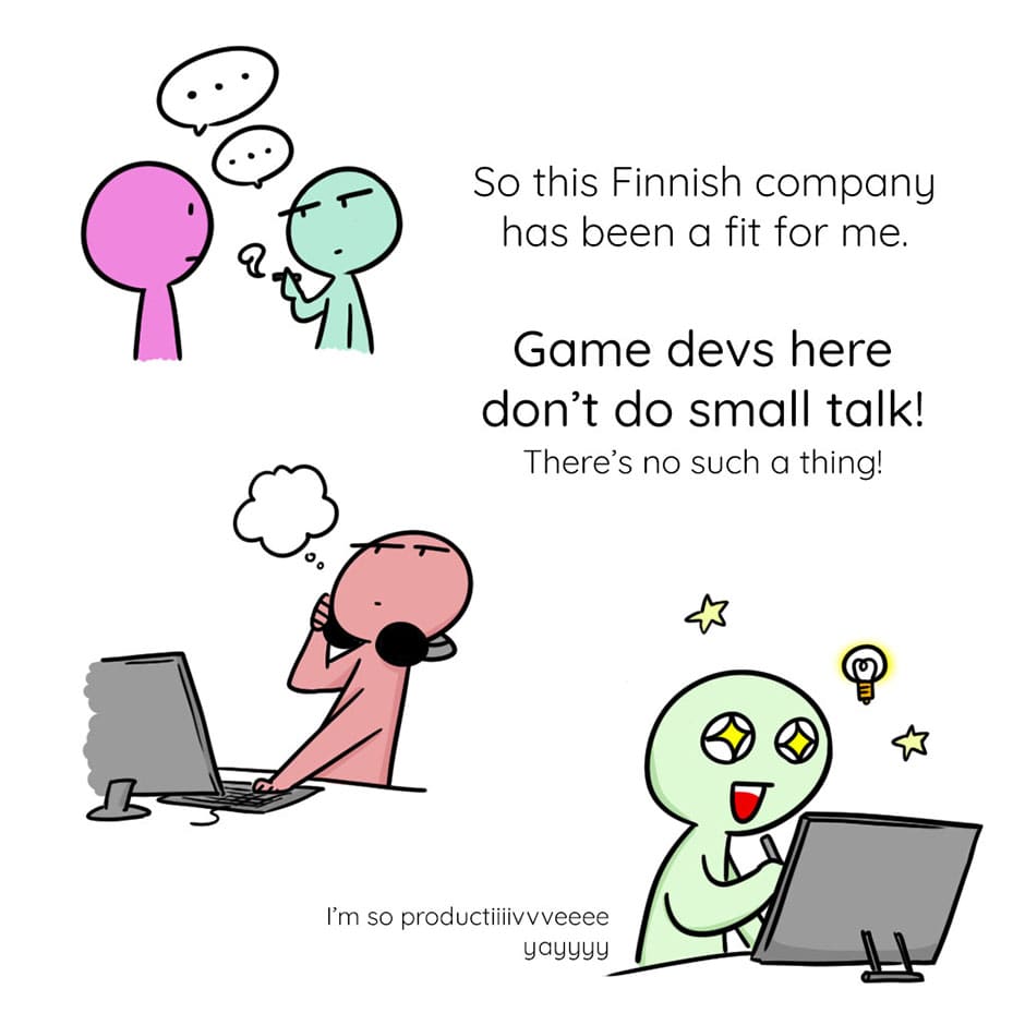 ⛄ Finland is known for its shy, less-talk, and introverted culture. 🥺 The same applies to (not all but) many Finnish game studios. 🕹️ So the term 'cultural fit' in the Finnish video game industry is often about being quiet and no small talks. And in many cases, no bragging! 😂
