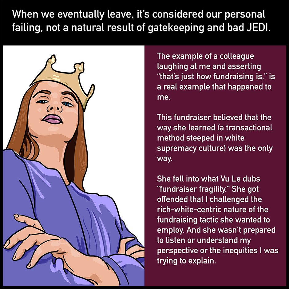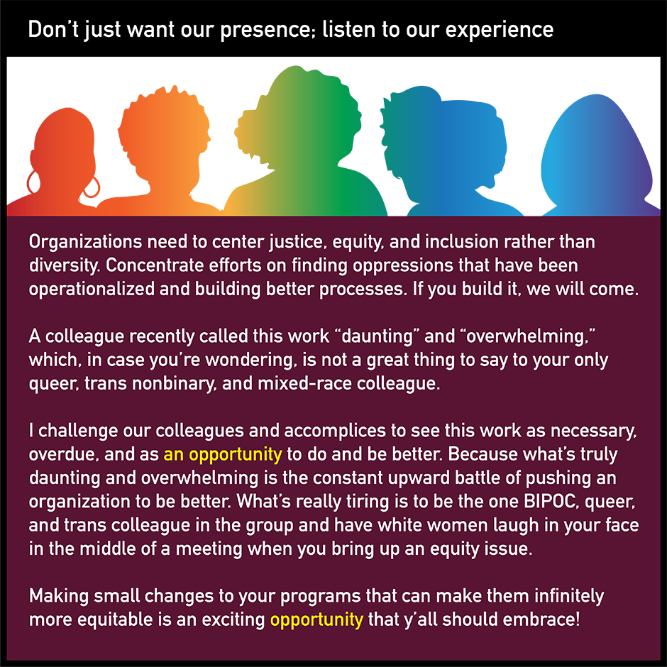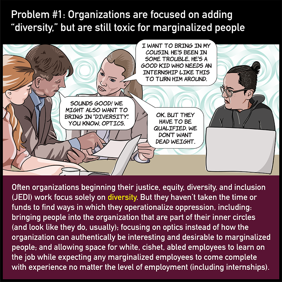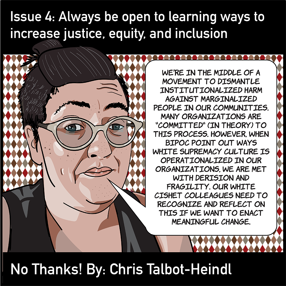 "Always be open to learning ways to increase justice, equity, and inclusion" explains why some organizations' justice, equity, diversity, and inclusion (JEDI) work keeps failing - they try to increase their "diversity" before doing any of the other work and expect that "diversity" they hired to mute themselves and fit into the toxic white supremacist culture of the organization. Check it out!