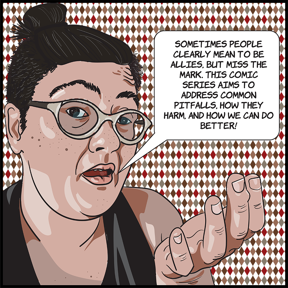 Sometimes people clearly mean to be allies, but miss the mark. This comic series aims to address common pitfalls, how they harm, and how we can do better!