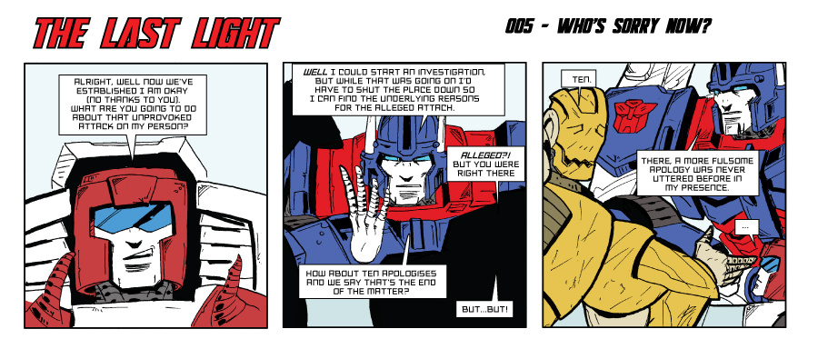 Set on board The Lost Light as a rag-tag group of Transformers are on a quest to find the Knights of Cybertron. This is what happens between the issues, and is of course a parody (or not if you want to add it to your own personal MTME headcanon as I won't stop you).
