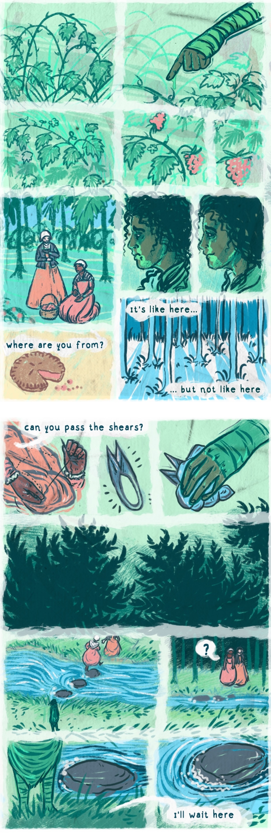 The Trees Are Different Here is a historical folklore fantasy, set in a fictionalised Early Modern Europe. The story has themes of immortality, responsibility and death as well as queer and gendered identities.