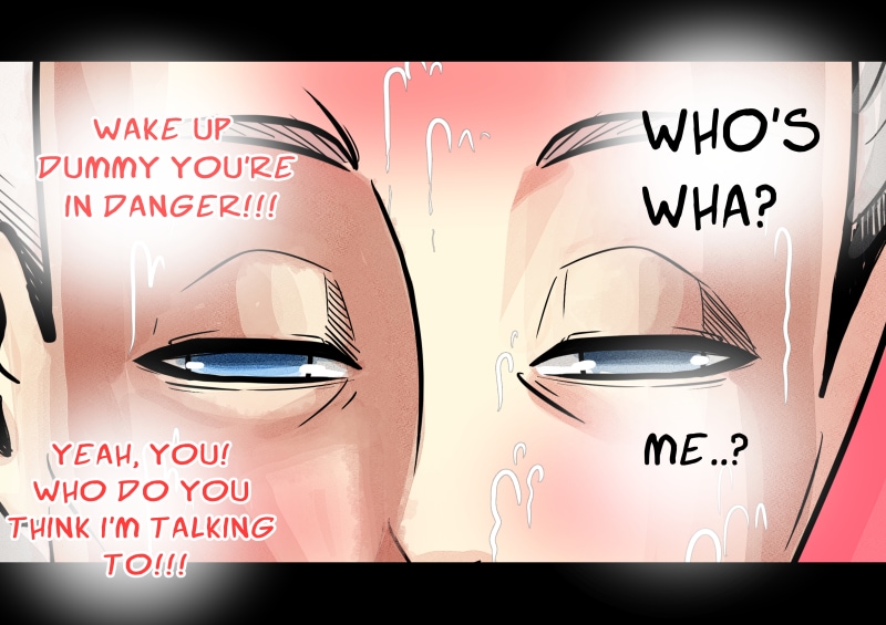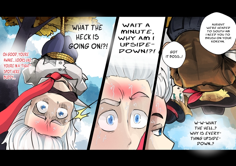I like the perspective you used when he is hanging upside down. Also nice expresssions and coloring :).