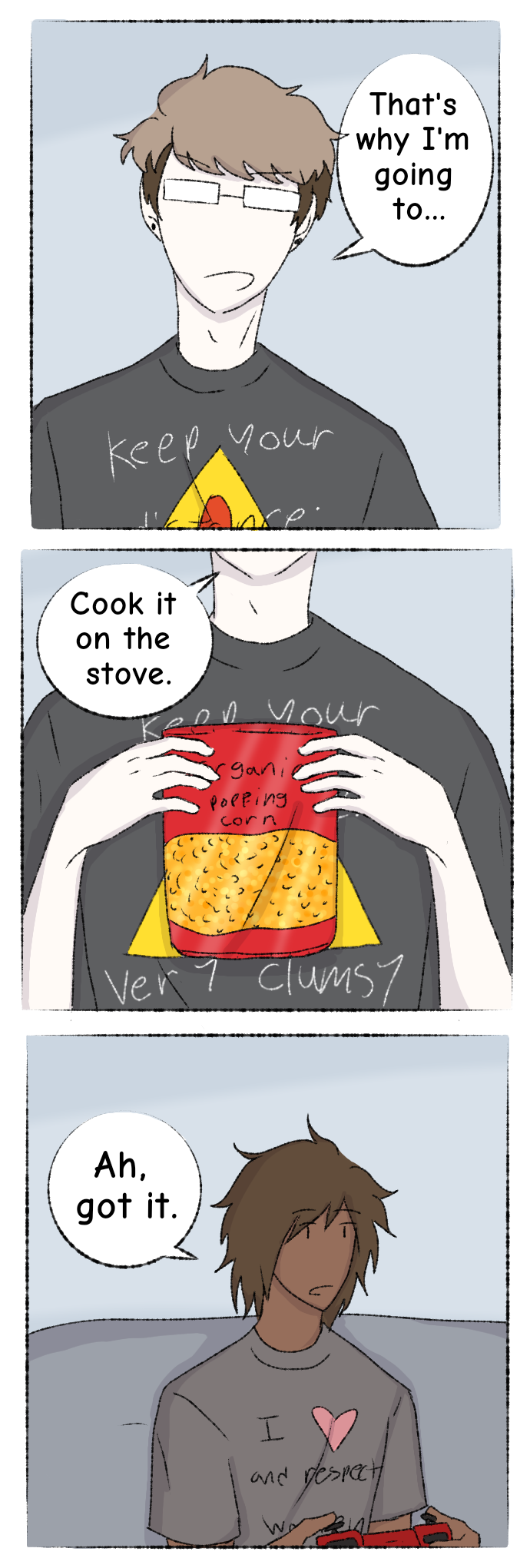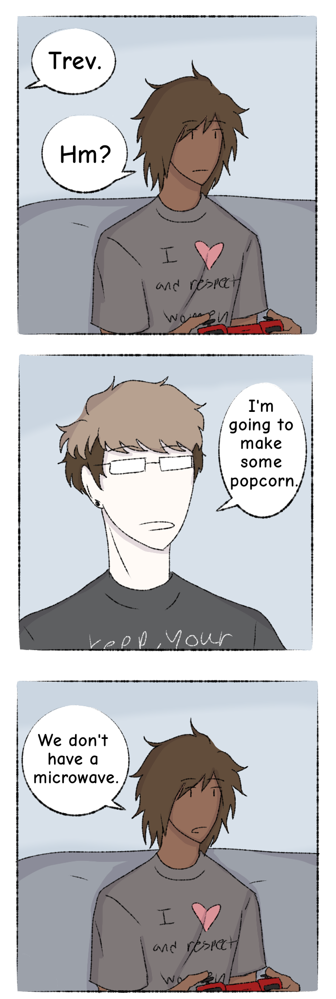 Ppff haha oh no big mistake Trevor xDD You can't let Allen use the stove alone xD Also really loving Trevor's choice of t-shirt slogans!! :D