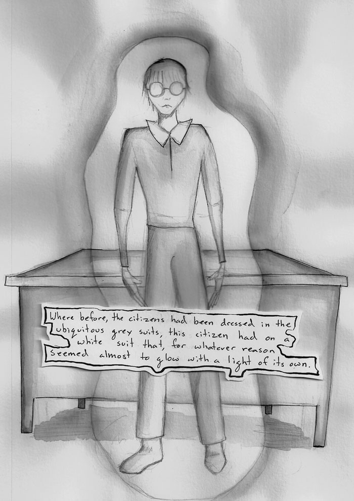 An alien guide in the form of a cat comes to help a man in a dystopian world where he doesn't fit.