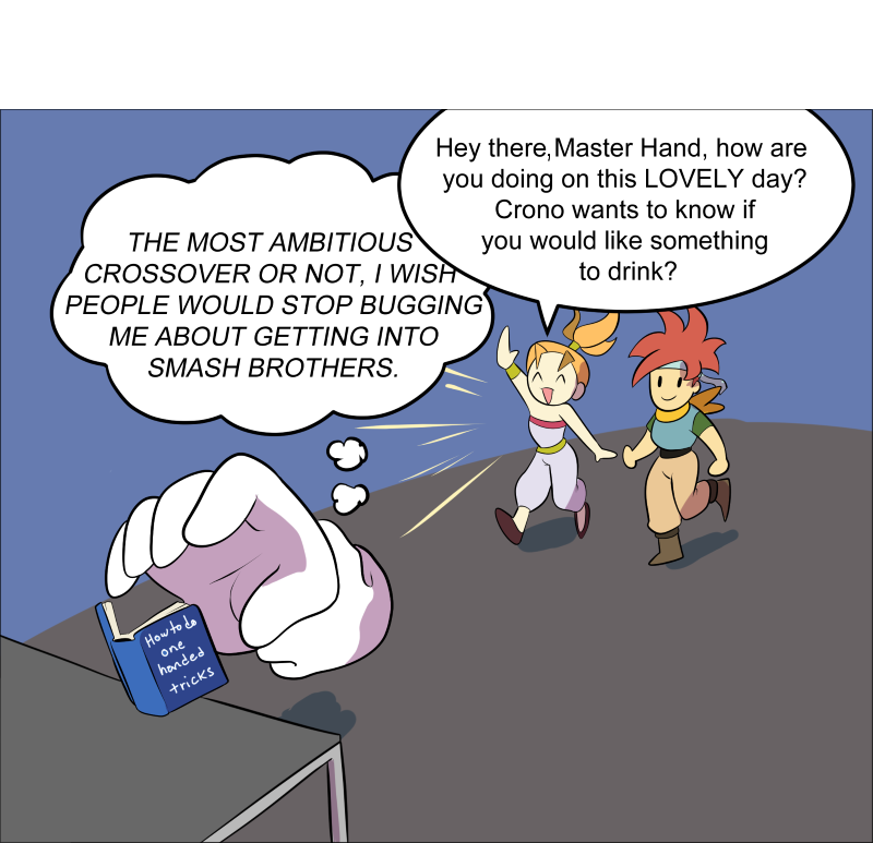 Drivo: I like to draw hands a lot, so drawing Master Hand was actually pretty fun. I also liked playing with the backgrounds and effects!