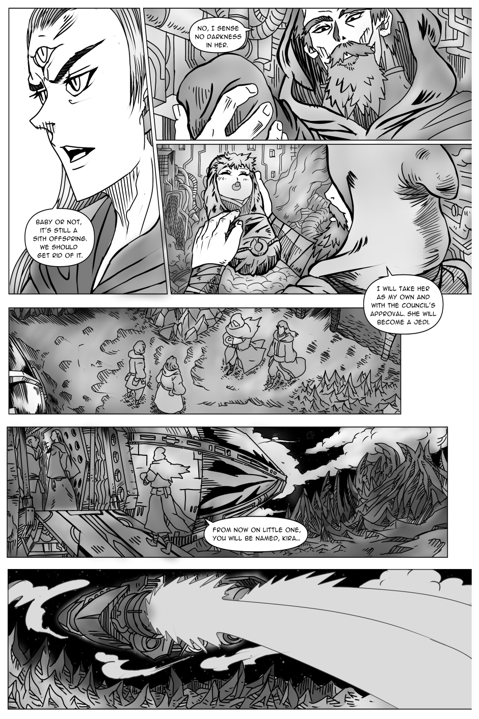 Reluctantly, the Jedi Council grants Master Tyrbus’s desire for Kira to be train as Jedi, when she is old enough. The Council’s decision did not met well with many of other Jedi, feeling having a Sith offspring in the order, breaks Jedi code. Lead by the ex-Jedi Zor’pur, he and other Jedi formed the Order of Purifier.