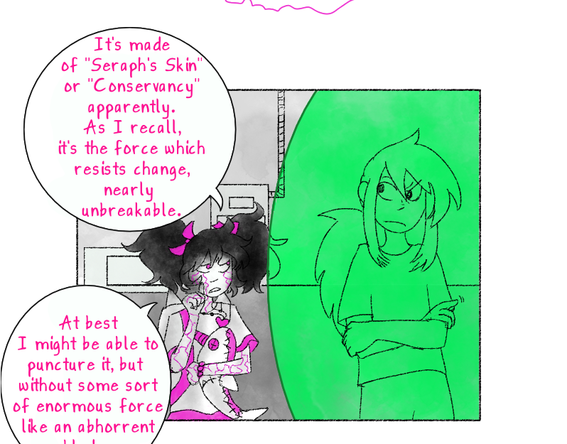 Shelly's power with the spiral tendrils looks so cool! Interesting that with teamwork they can break the field. Everybody seems so surprised about the abhorrent blade though! Poor Alena, but at least she's getting out of there! Hm, something tells me that if "Seraph's skin" is more than just a metaphor, it was not ethically harvested.
