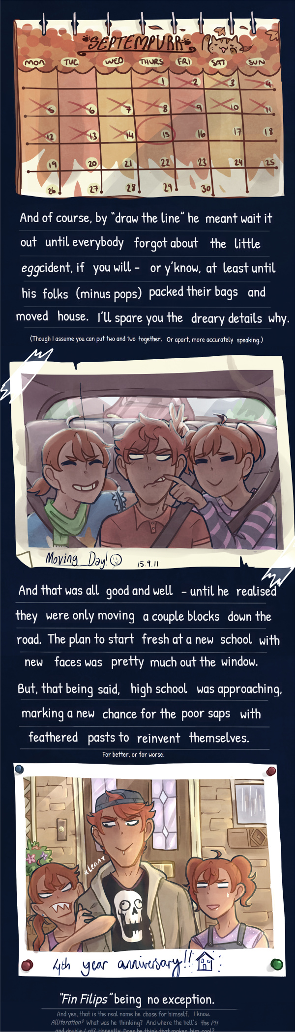And a loooootta reading. Here's some more! Fin's 16 now (5th year in high school) so I tried to change his design to look a bit closer to his age as he looked about 12 when I first drew him (see page 1). Hope you don't mind!