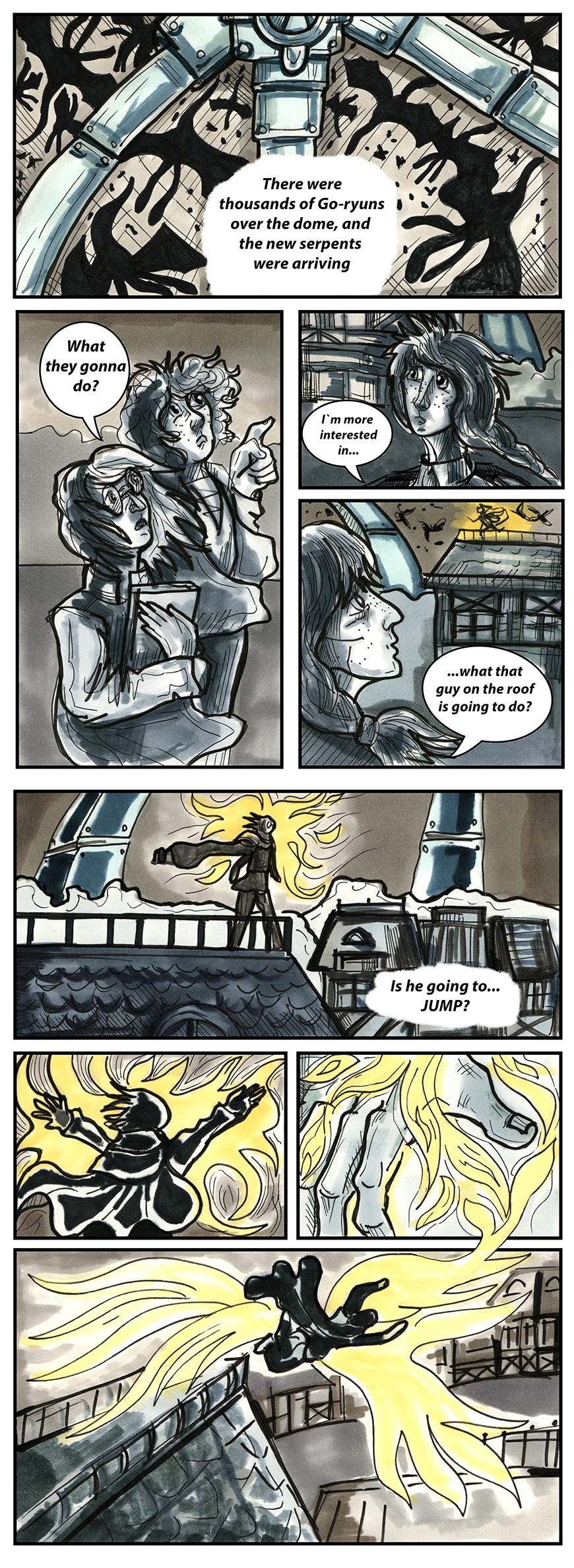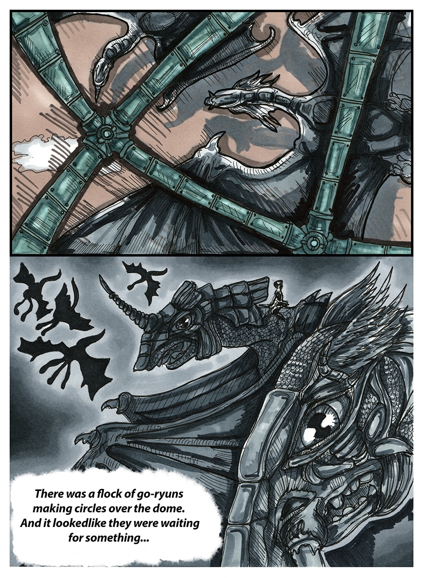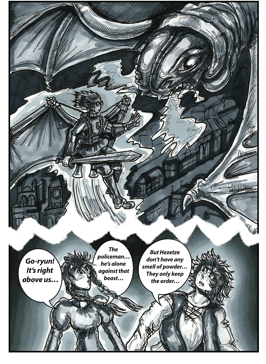 Humans lost their battle aganst Go-ryuns - fire breathing dragons. The protective domes over and even underground colonies are not safe anymore. Who will be a new hope? The young geologist and his mechanical dragon? The military academy cadet who obtained a strange ability? The emotionless enforcer with a mysterious past? The half-lizard girl? The scientist with no name? Or the ancient prophesy will be fulfilled and the legendary Savior with a Single wing will come from the dark to unite those who made of flesh and made of iron?