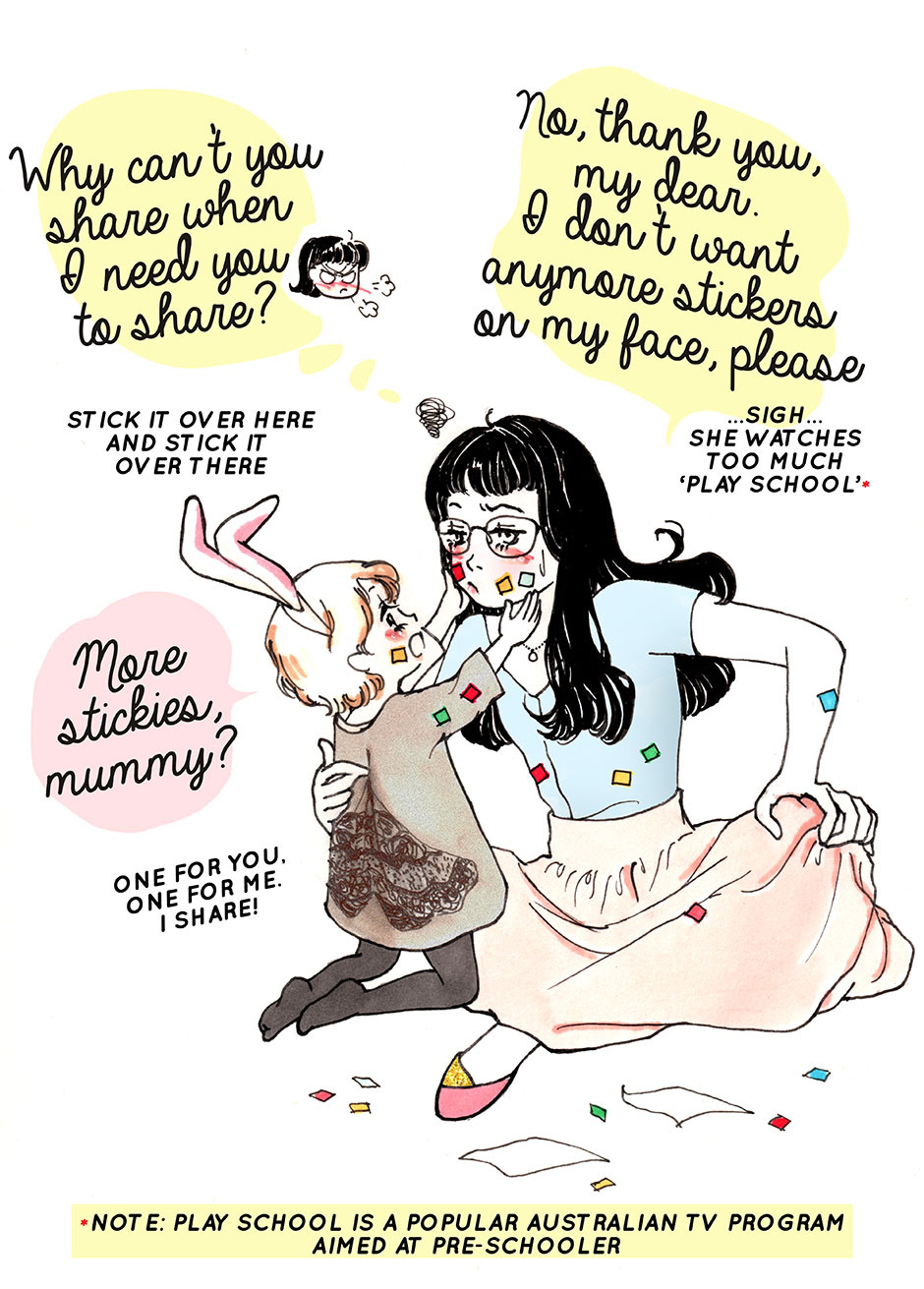 Ever wonder what it's like to be stuck at home with two little children under the age of 7? Welcome to my parenting (mis)adventures where running the lives of two little people become both the highest and the lowest of my days. And when you can't get even with them, you just throw your hands in the air and start drawing comics! *snickers*