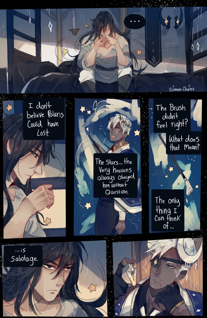 A love story about a King and his knight. Polaris is the king of the stars who paints the very constellations into being in order to protect the heavens. Yildun is his loyal knight, forever at his side, and deems himself unworthy to even be seen by the King. This story is told in a disjointed manner, I am drawing the scenes most interesting to me, and will connect the gaps with short paragraphs.