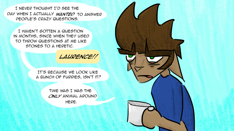 I also realized after posting the first page that it looked like this was a furry comic. To clarify: This used to be just a fox man. Somebody sent him a cat, and since I can't draw adorable kitty cats, I made it a cat person. Then, because of a bizarre gender-bending event, I decided to revive the comic with a female character that looked like Laurence for a bit, requiring a second fox. And the green lizard is a dragon.