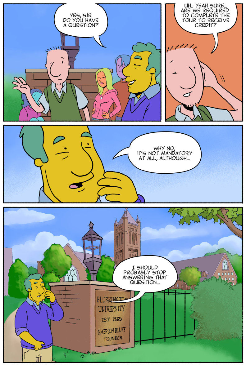 Like a lot of us, Doug had a lame time in high school, but college years are here, and so are a lot of old (and new) faces! Join us here at Bluffington University, good old B.U. !