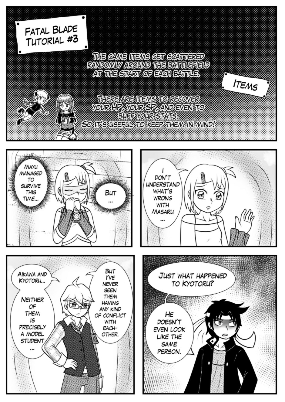 Fatal Blade is a new videogame released by the famous Amamiya Corporation. A revolutionary fighting game in virtual reality that allows the player to fight with all his strength. The story starts in the city of Kaizaru, where a young girl named Mayu Aikawa is an amazing player followed by her only friend Hana Ayano. One day, after having a battle with one of her classmates, he started acting strangely and everything around the game became crazy... and then... a strange kid appeared inside the virtual world...