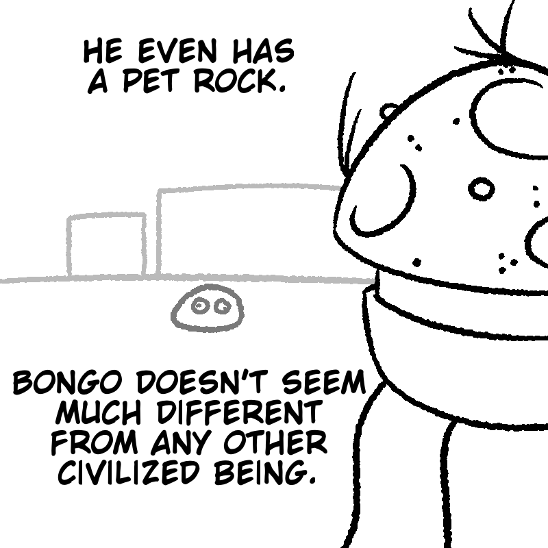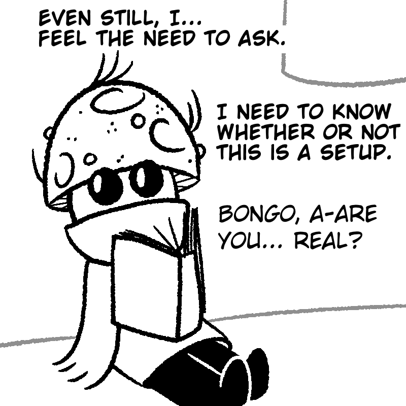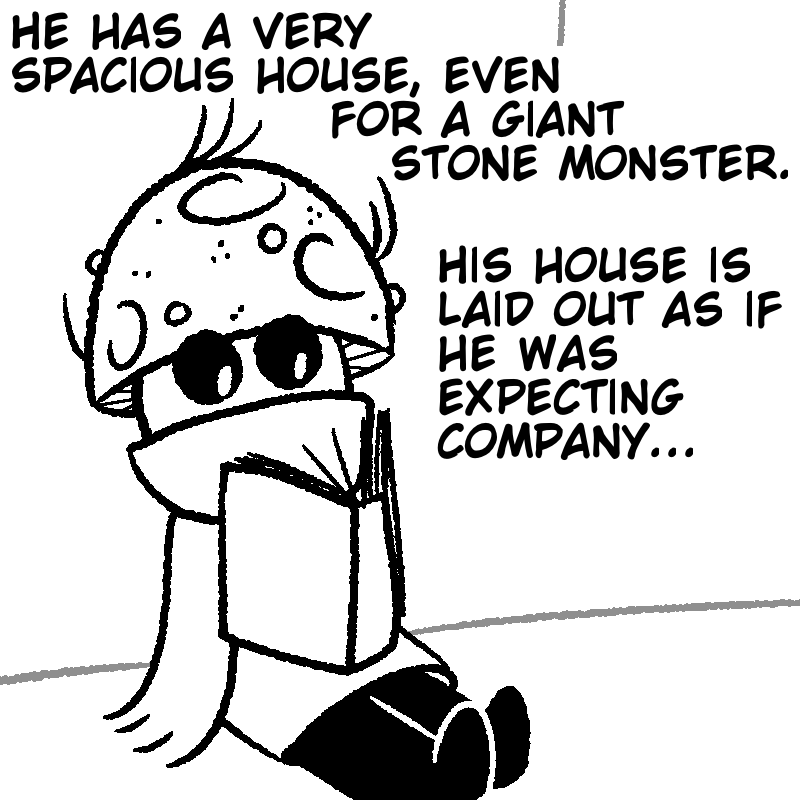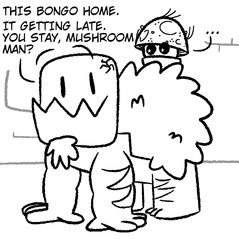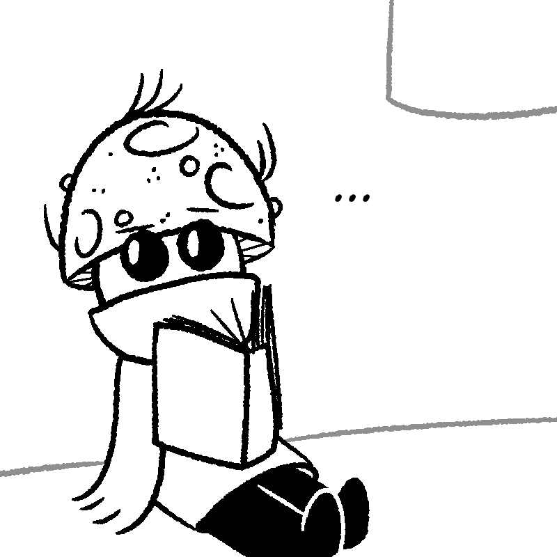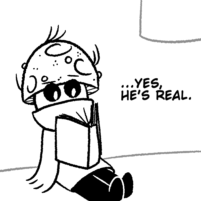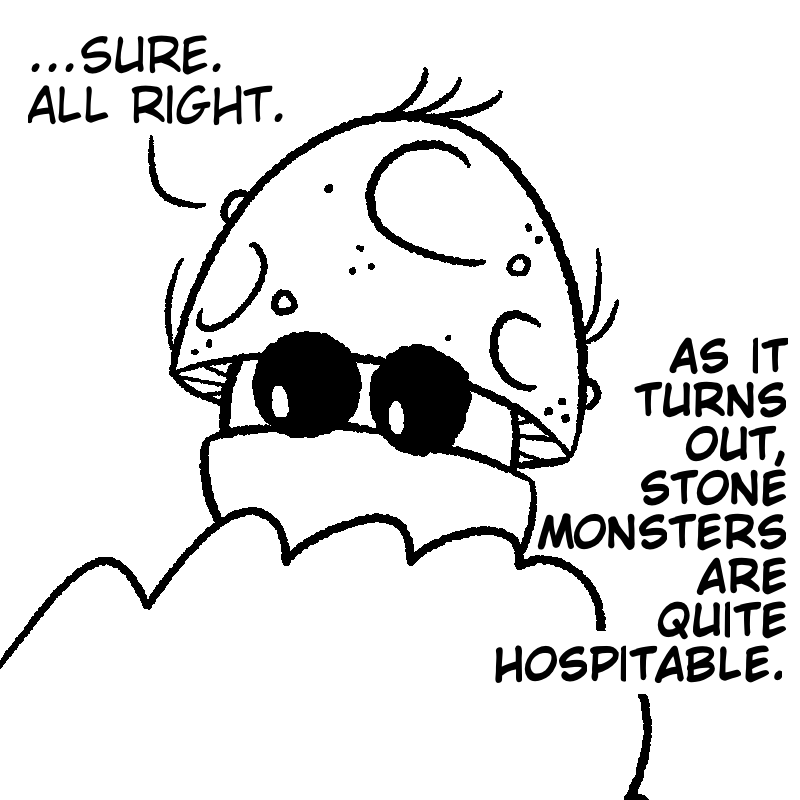 Mushroom George lived most of his life in the smallish town of Halsley, with a job at Capcorp as a paint watcher. After a long period of planning, he set off on a long journey throughout the land to find the big deciduous tree he'd read up on some time ago. Soon enough, his boss noticed he was gone... and replaced him. But after a while, the rest of the townsfolk started to worry for Mushroom George's safety. No one ever leaves Halsley. Everyone's safe from everything in Halsley.