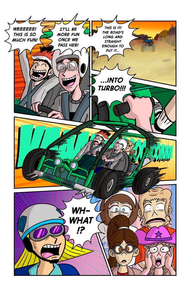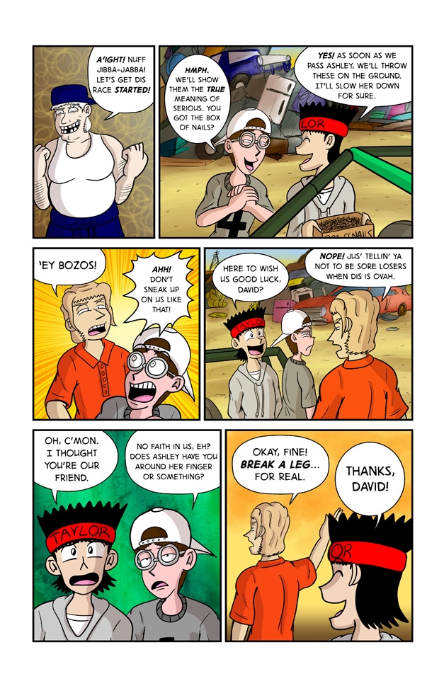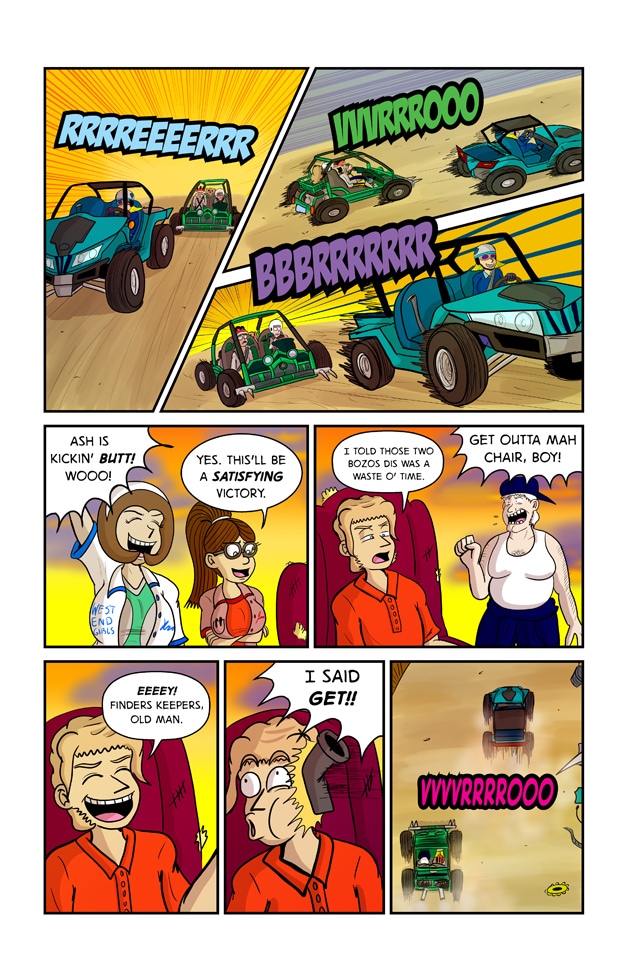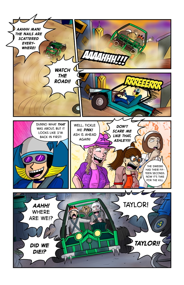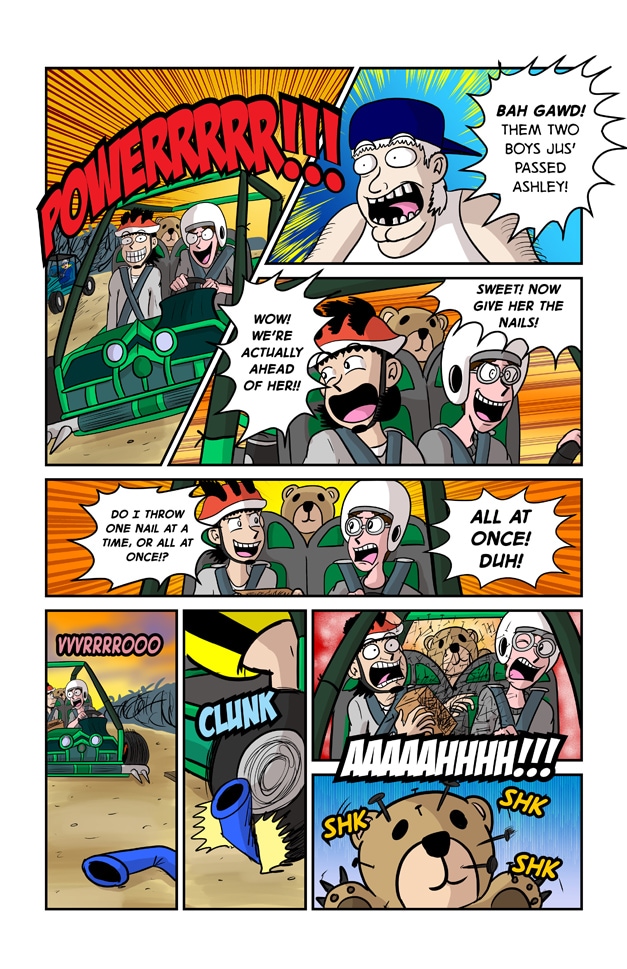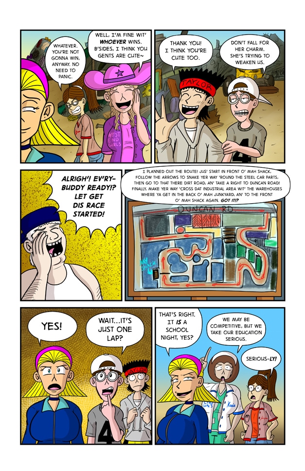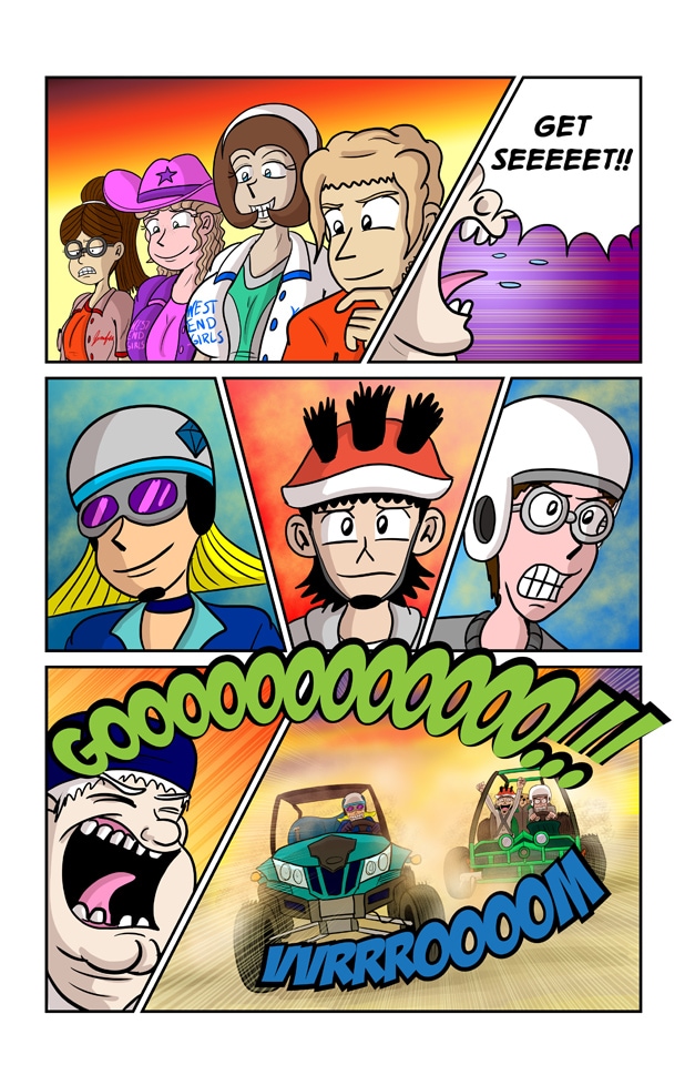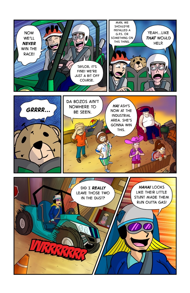 In this exciting issue of Jeff & Taylor: Jeff and Taylor are challenged to a late night car race by four busty high schoolers, The West End Girls. Since the boys don’t have a car of their own, they will have to restore their old go-kart with the help of their scientist friend, Kim Greenleaf. With her upgrades to the go-kart, the boys will have the technical advantage in this street race! But will the plan go smoothly? Or will the boys be biting the dust?