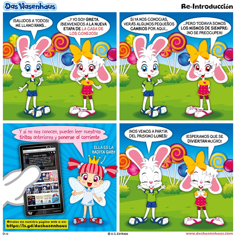¡Bienvenidos a nuestra tirita cómica! Los que ya nos conocían se sorprenderán con las novedades que encontrarán, y los que apenas nos conocen descubrirán las vivencias cotidianas, las aventuras y travesuras de nuestros personajes. Hans y Greta les dan la bienvenida y los esperan a partir del próximo lunes para comenzar a ser felices junto a ellos :)
