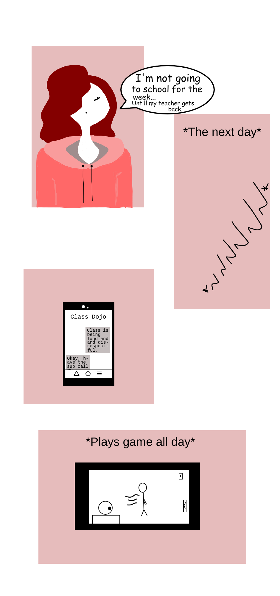 When your teacher is home sick. The entire class room erupts into flames of screaming. You see, i'm not good with loud noises. so I stayed home today.